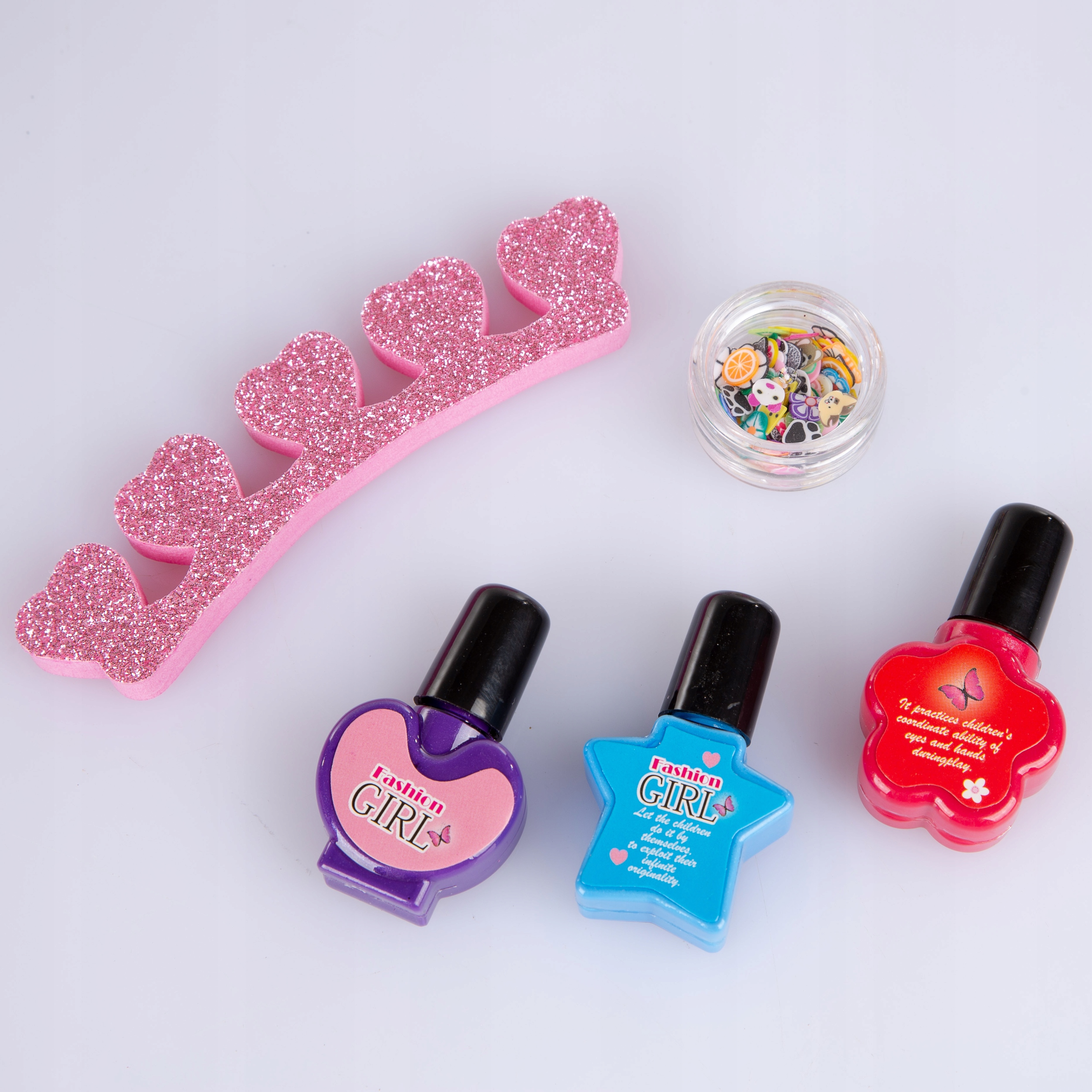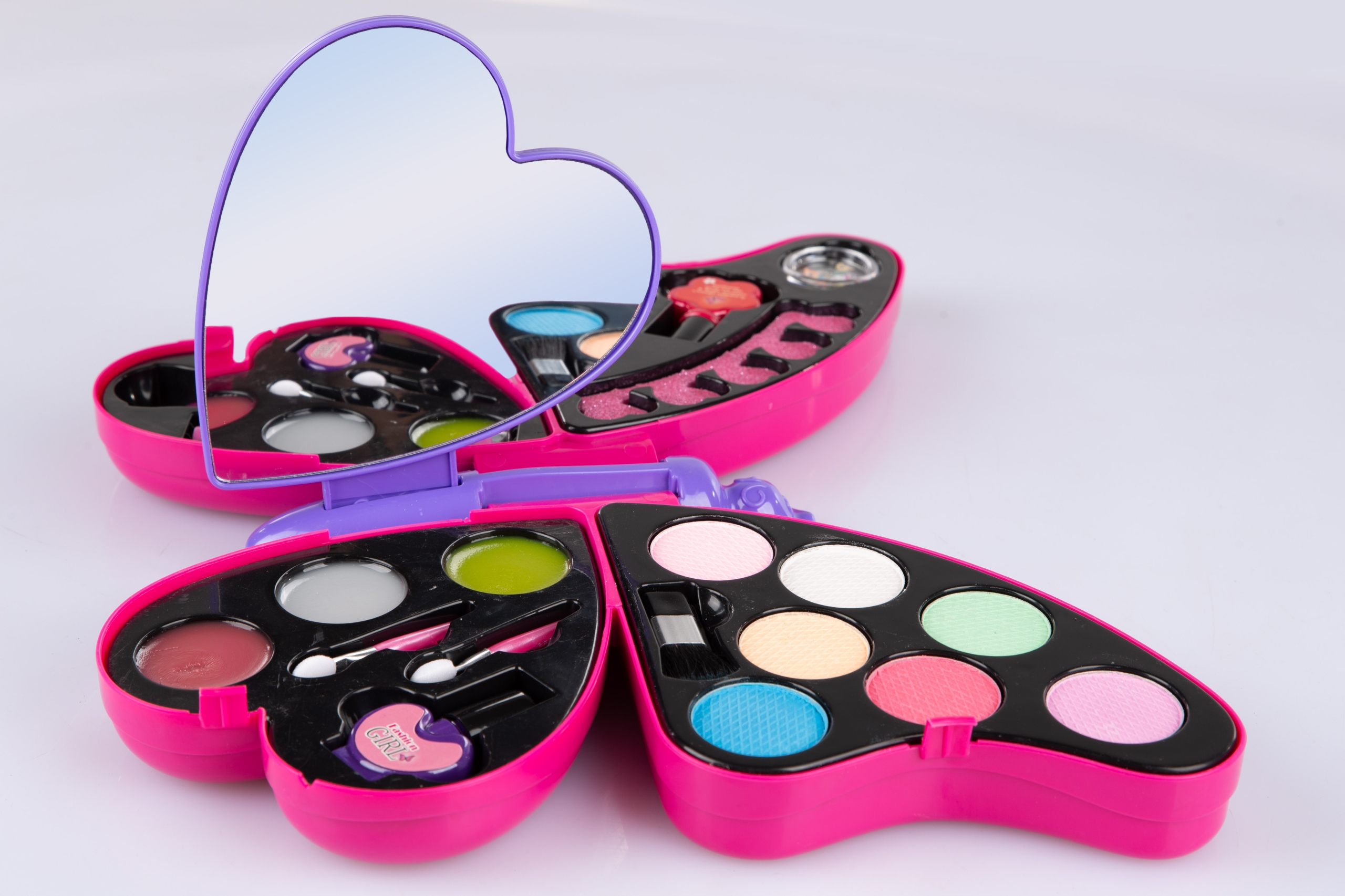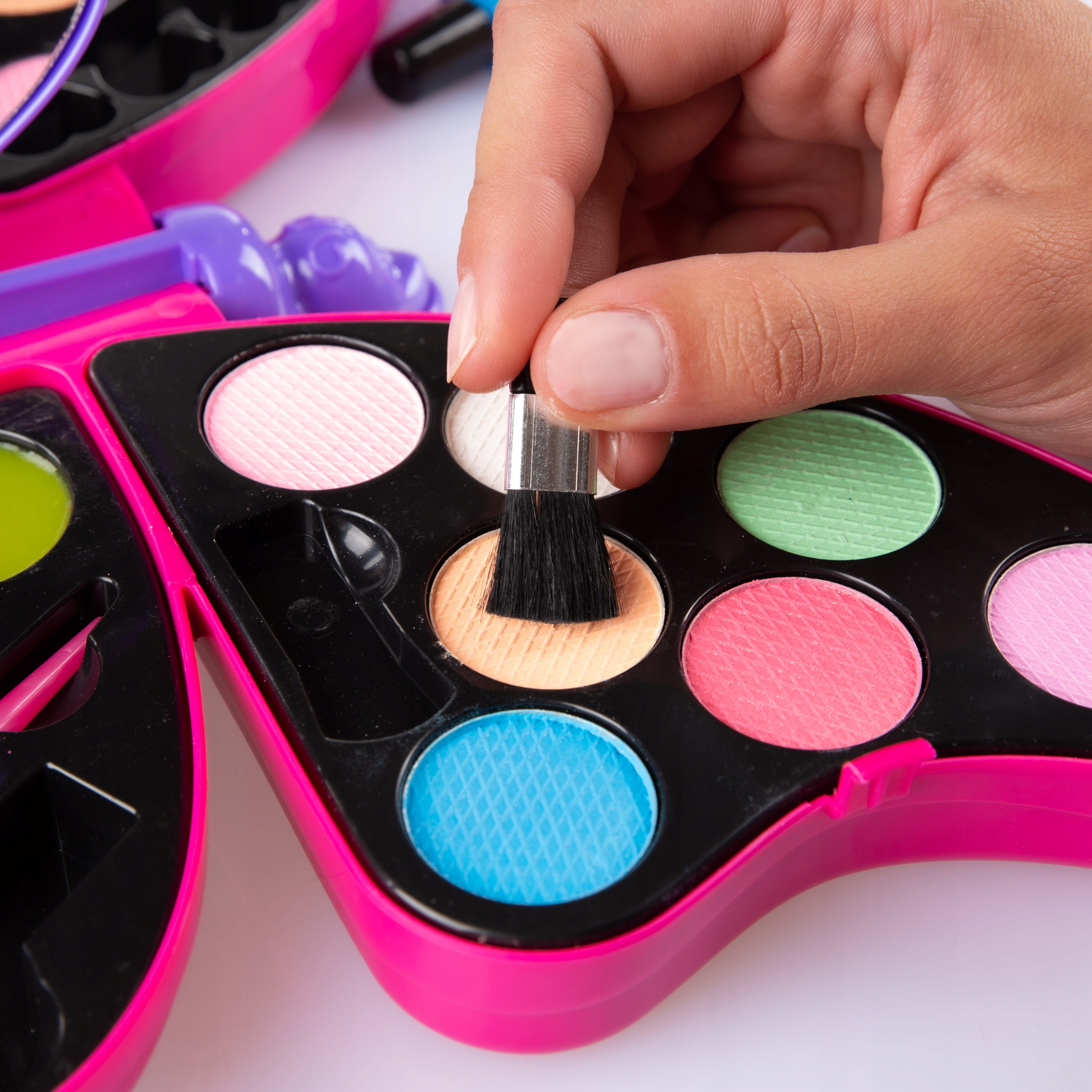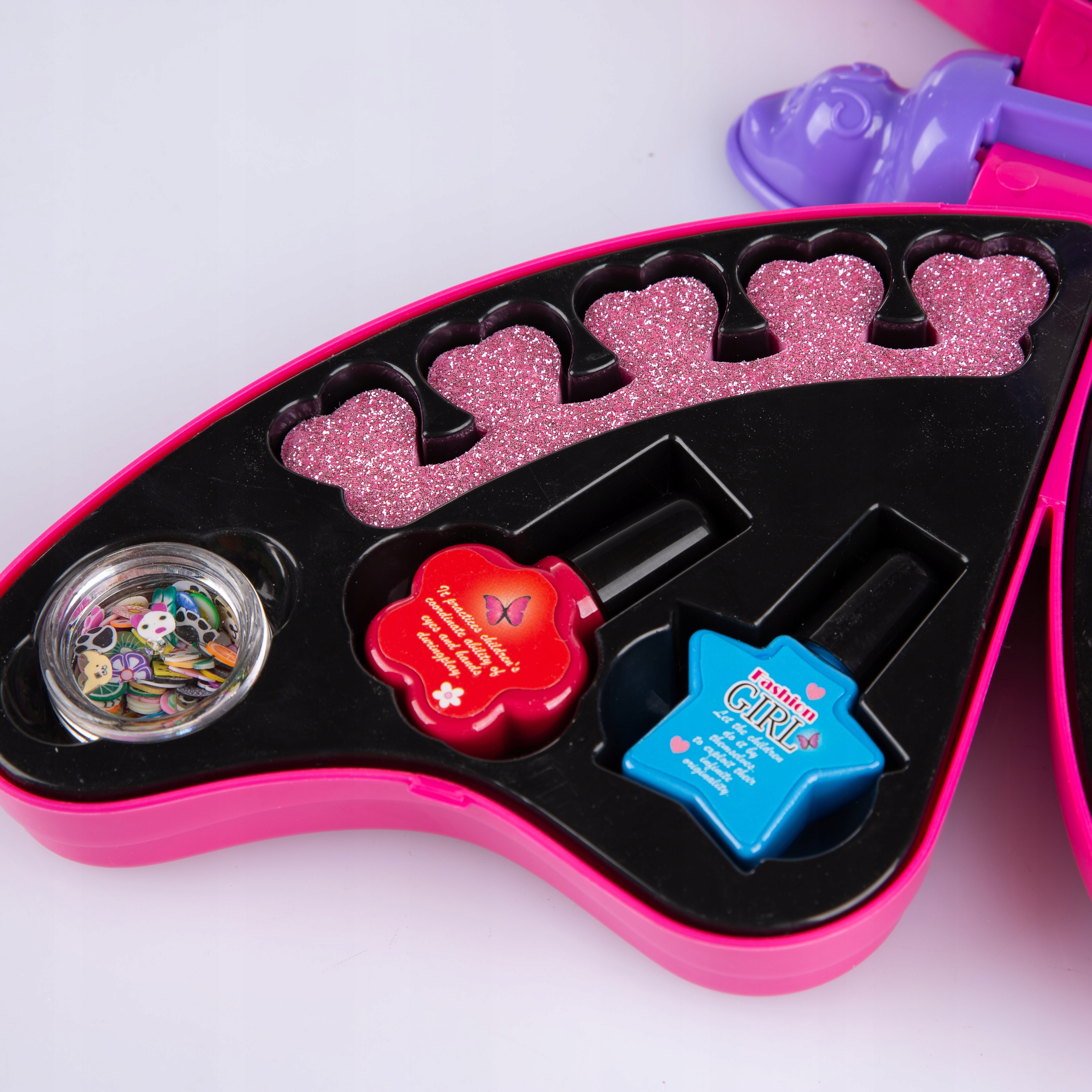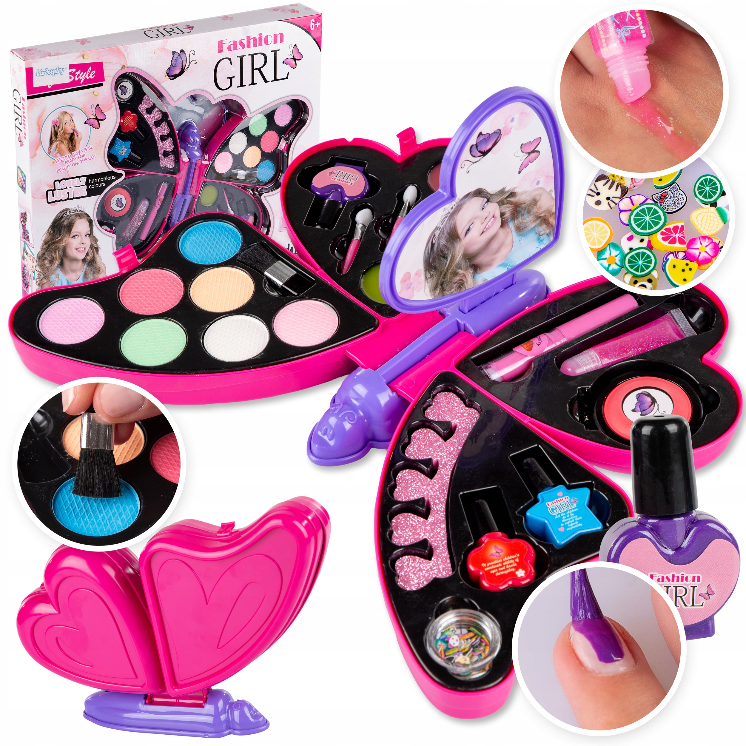 Набір, завдяки якому кожна дівчина зможе зробити свій перший самостійний макіяж і манікюр. У нас є всі необхідні матеріали для завершення перетворення: пензлі, тіні, блиски для губ, лаки для нігтів тощо. Аксесуари поміщені в коробку у формі метелика. Коробка закривається, тому після гри її можна легко покласти в сумку або рюкзак. З цим набором ваша дитина почуватиметься справжньою зіркою.
