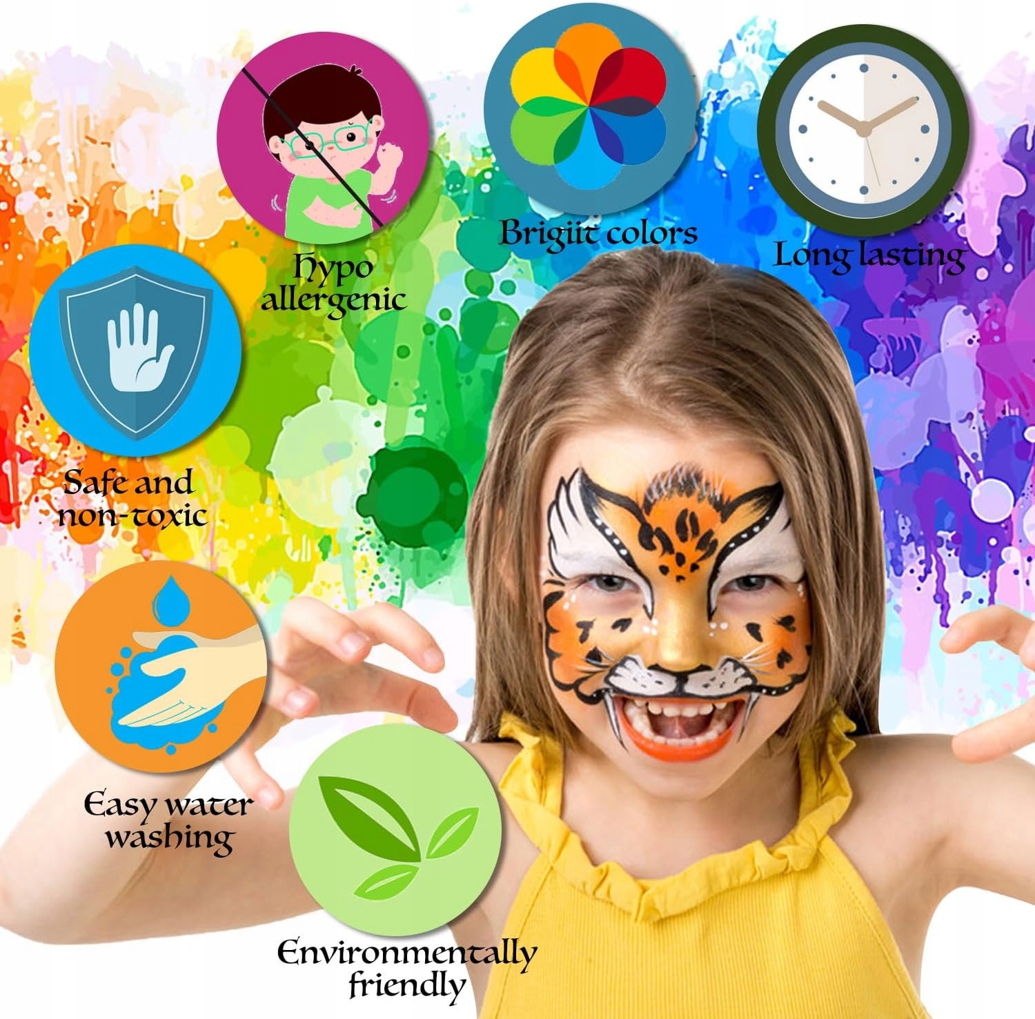- Набір для фарбування обличчя та тіла повністю виготовлений на водній основі, тому прибирання – легке.