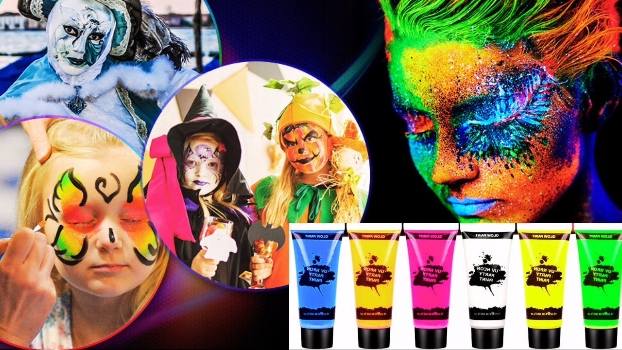 Сяючі кольори: Флуоресцентні фарби для обличчя та тіла мають 6 яскравих кольорів, які світяться в спеціальному УФ-світлі ( тобто ті, які ви бачите на вечірках).