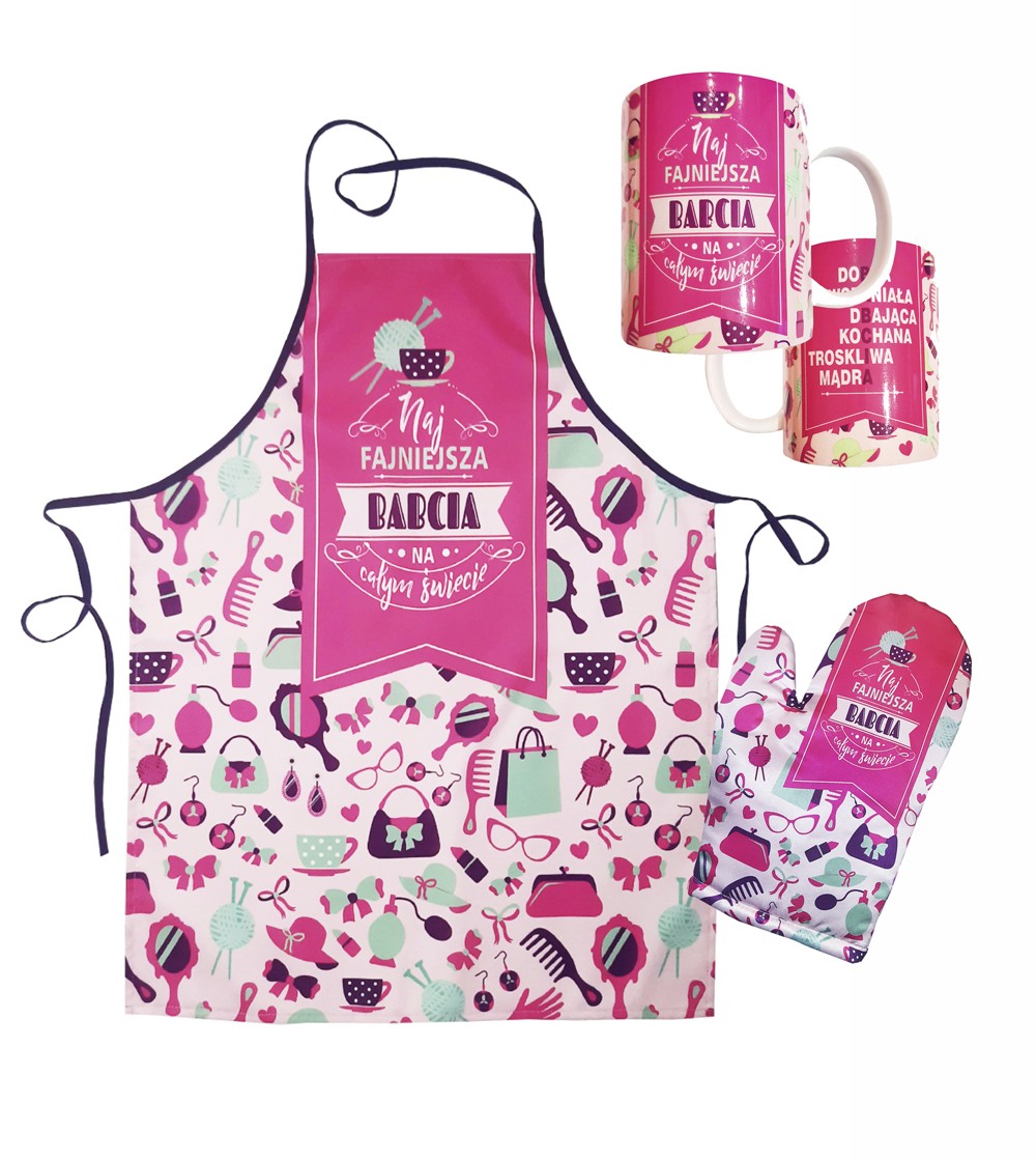 Шукаєте оригінальний і практичний подарунок на день бабусі чи день народження? Набір, що складається з оригінального фартуха, рукавички для духовки та кухля - ідеальне рішення.