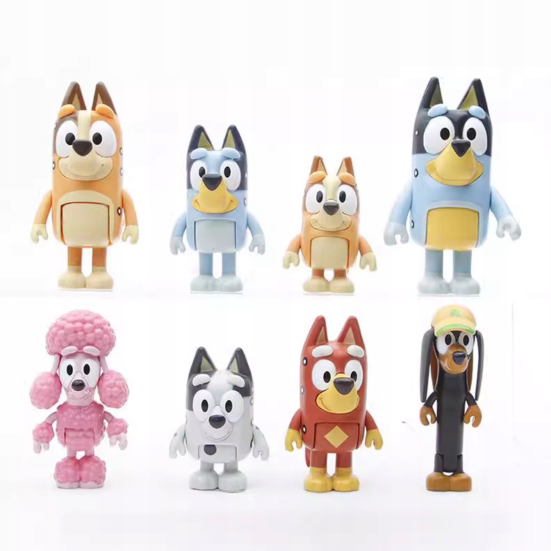 Чотири члени сім’ї Блуі: Блюі, Бінго, Банджі ( тато) і Чілі (мама) і 4 друзі Блюі та Бінго: Коко, Снікерс, Расті та Маффін. Є багато наборів іграшок та аксесуарів, які збагатять світ Bluey's.