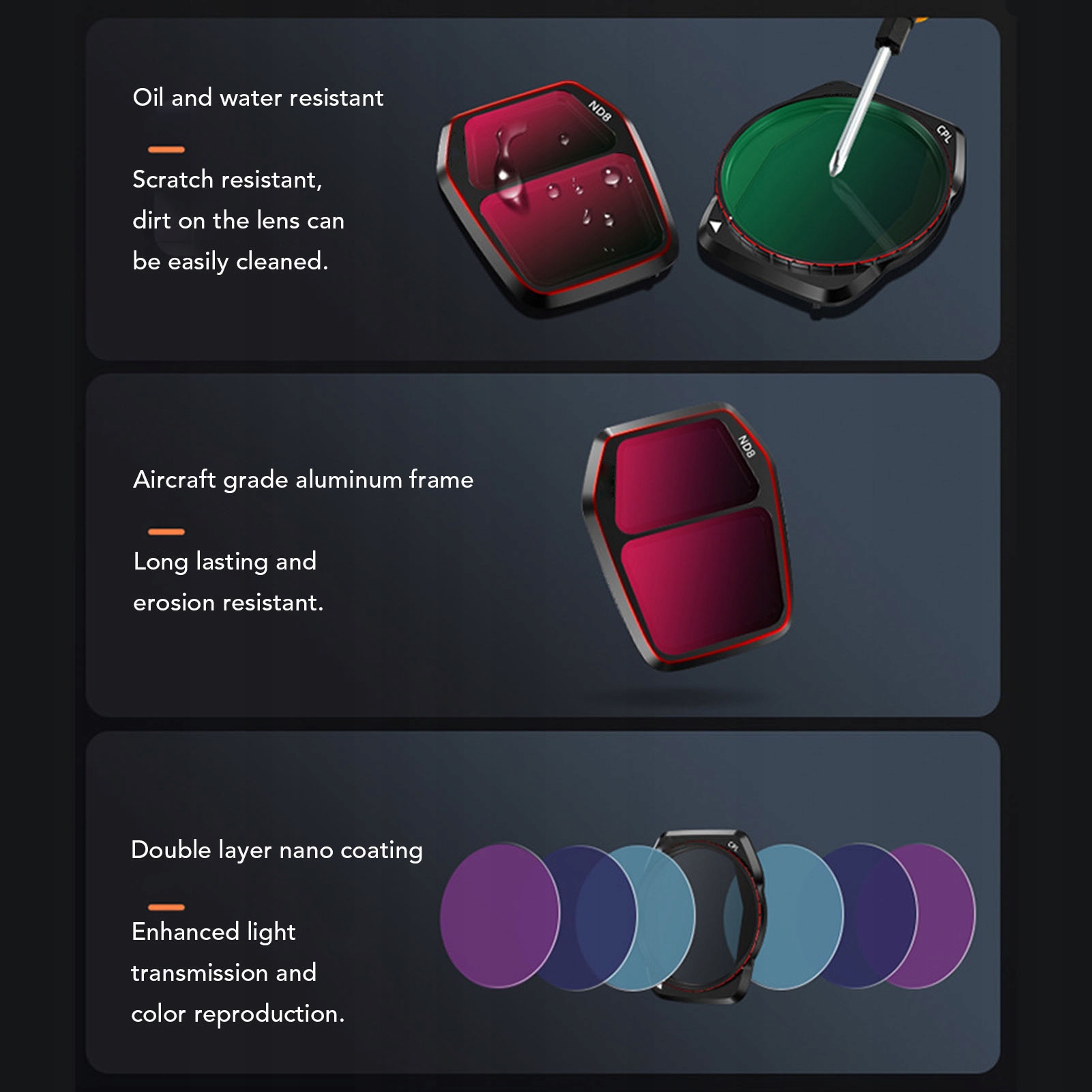 1. Оптична прозорість з високою роздільною здатністю: набір фільтрів безпілотників, виготовлених з точно шліфованого оптичного зору, забезпечує зображення високої роздільної здатності. Авіаційна алюмінієва рама доступна в чорному кольорі, що запобігає світовим витоком та ефектам привидів.