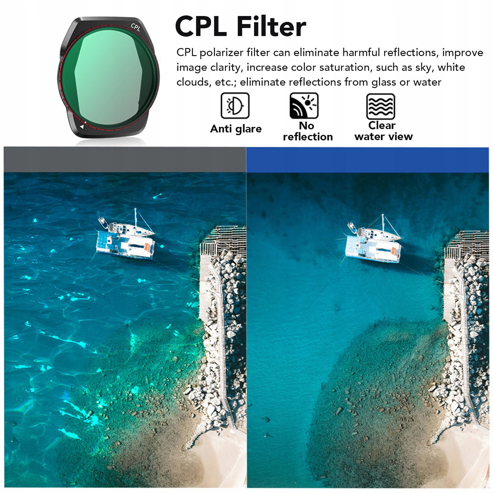 4. Переваги фільтра CPL: Фільтр поляризації CPL усуває шкідливі відбиття, покращуючи чіткість зображення та насичення кольорами, і зменшує відбиття з поверхні або поверхні води.
