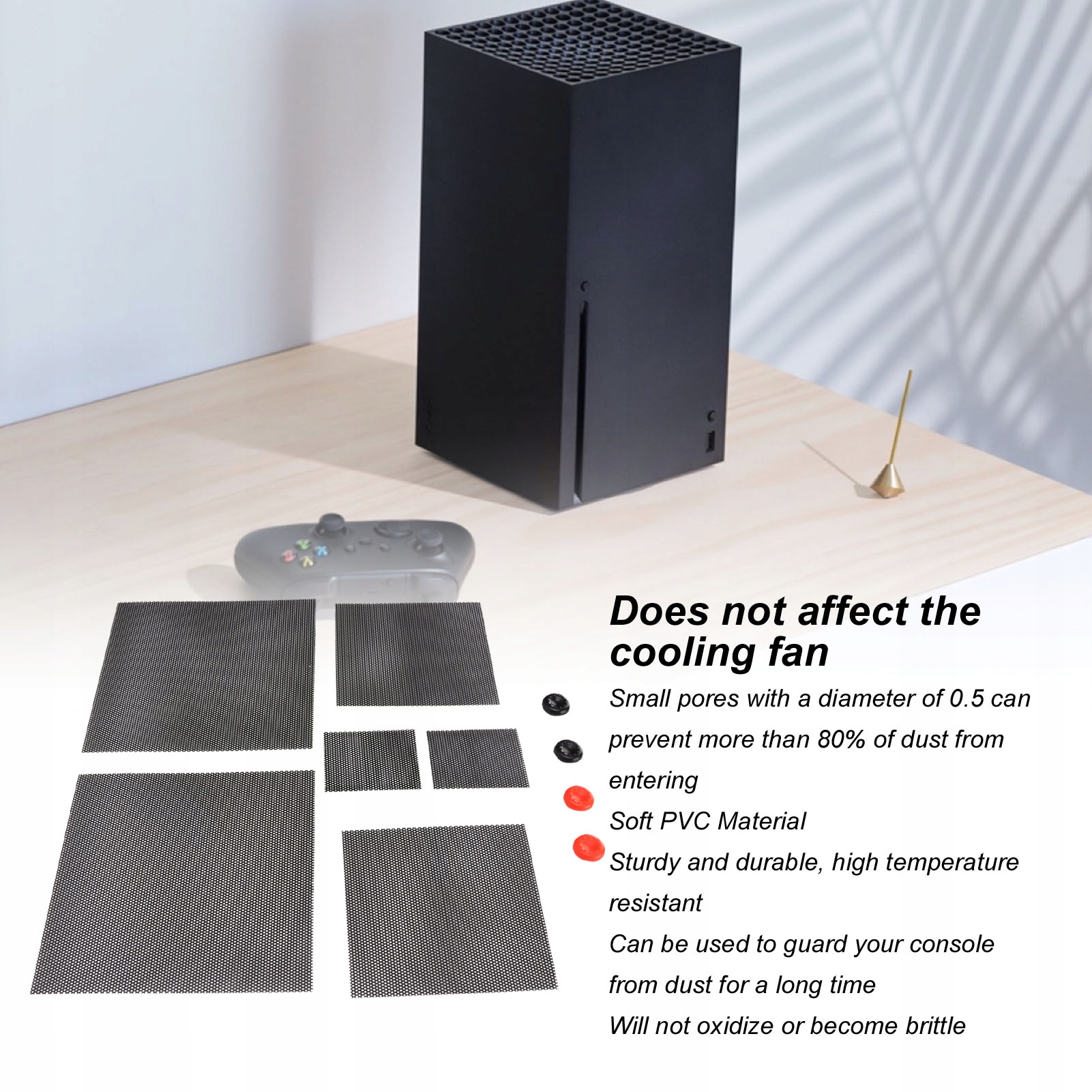 2. Точне різання: кришка пилового фільтра призначена лише для X BOX серії X. Точного розміру, щоб закрити будь-який вентиляційний отвір. Маленькі отвори діаметром 0,5 можуть запобігти проникненню більше 80 пилу, не впливаючи на роботу вентилятора.