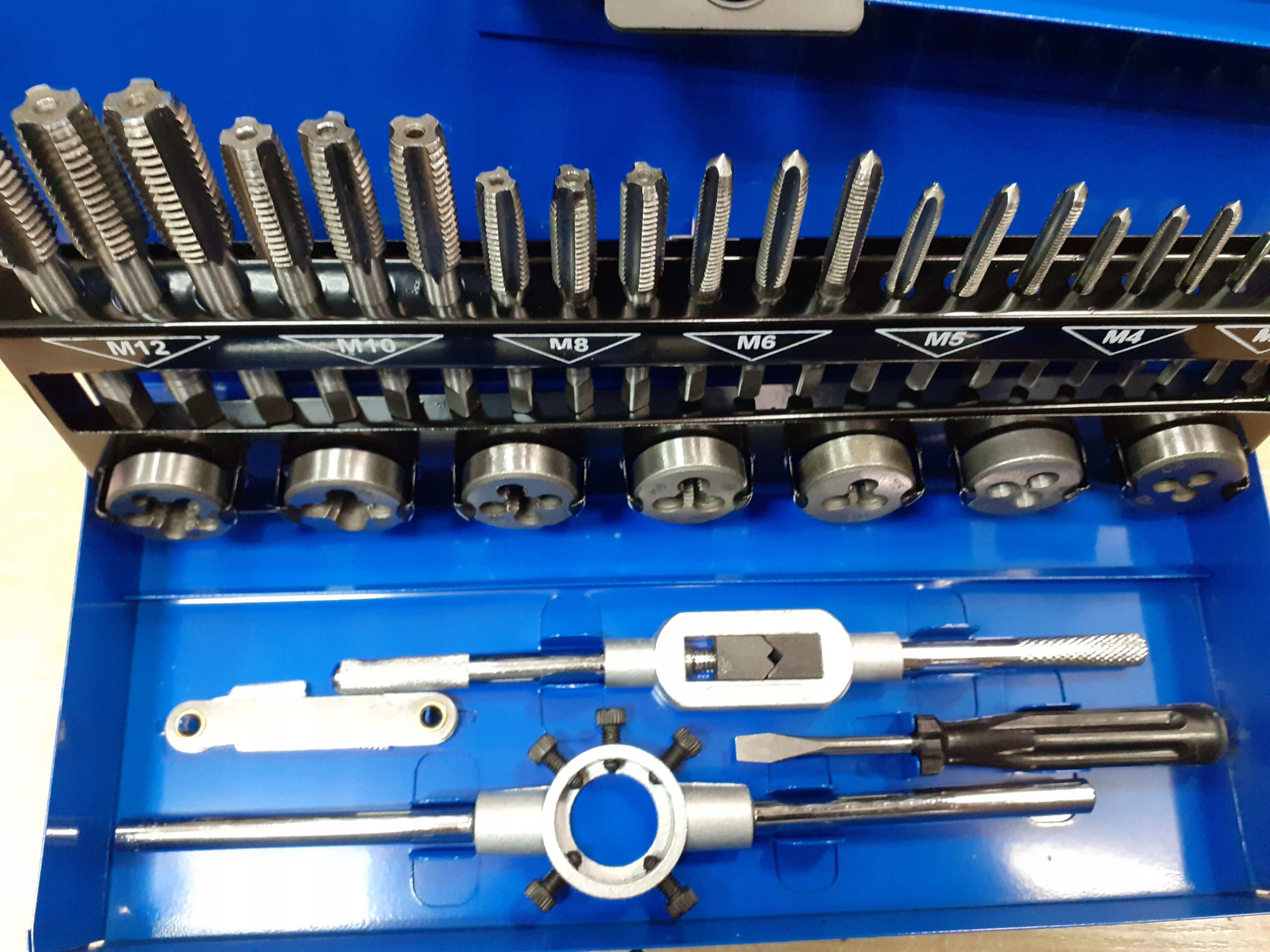 Сучасний набір мітчиків і плашок M3 - M12. У набір входять 32 різних інструменти з високоякісної сталі. Все було поміщено в металевий футляр для транспортування та зберігання.