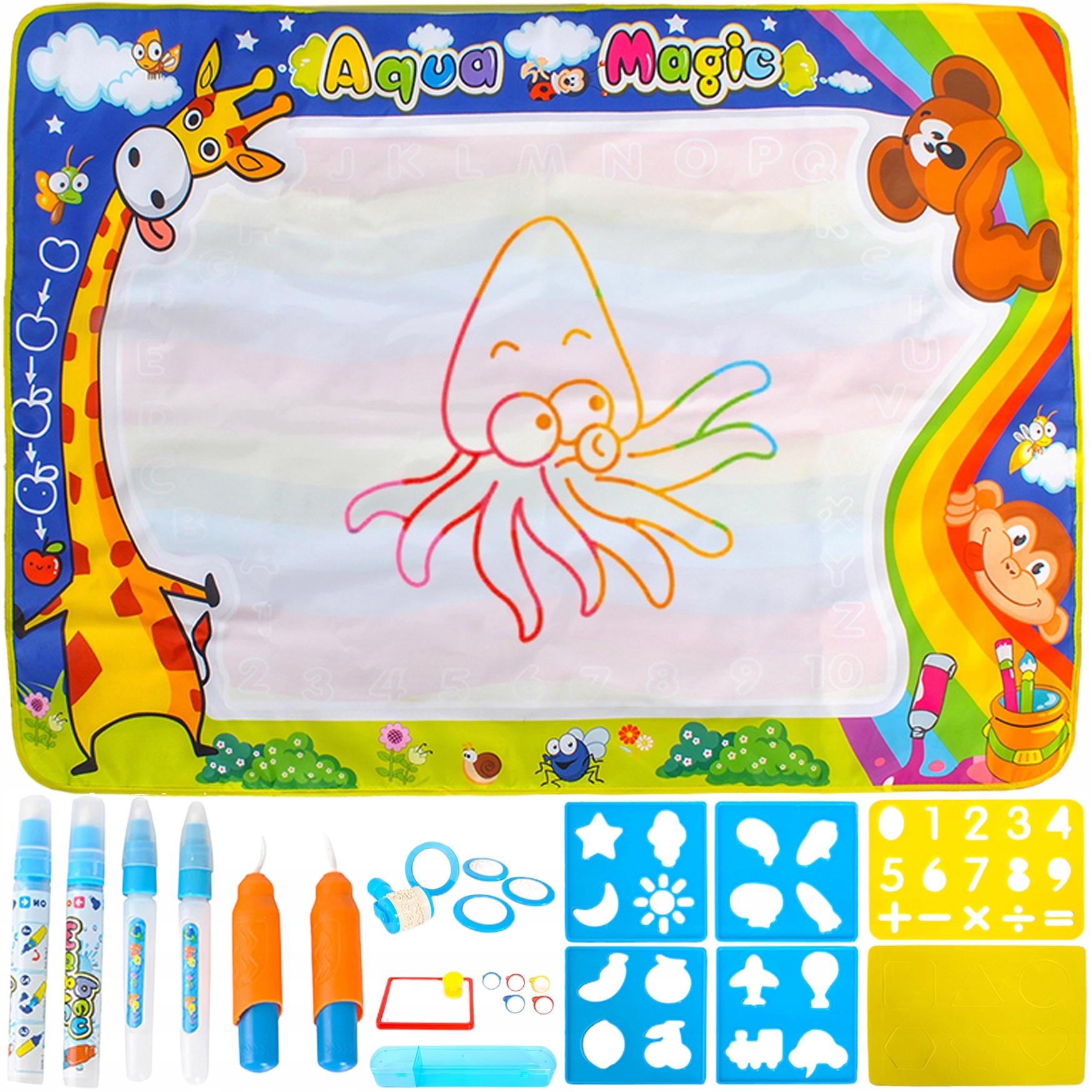 Килимок для малювання у воді має барвистий малюнок, який привертає увагу дитини та спонукає до гри. Різнокольорові елементи, розміщені на килимку, дозволяють створювати малюнки різноманітних відтінків. Крім того, килимки прикрашені цифрами та літерами, що допомагає у навчанні та розвитку уяви дитини.