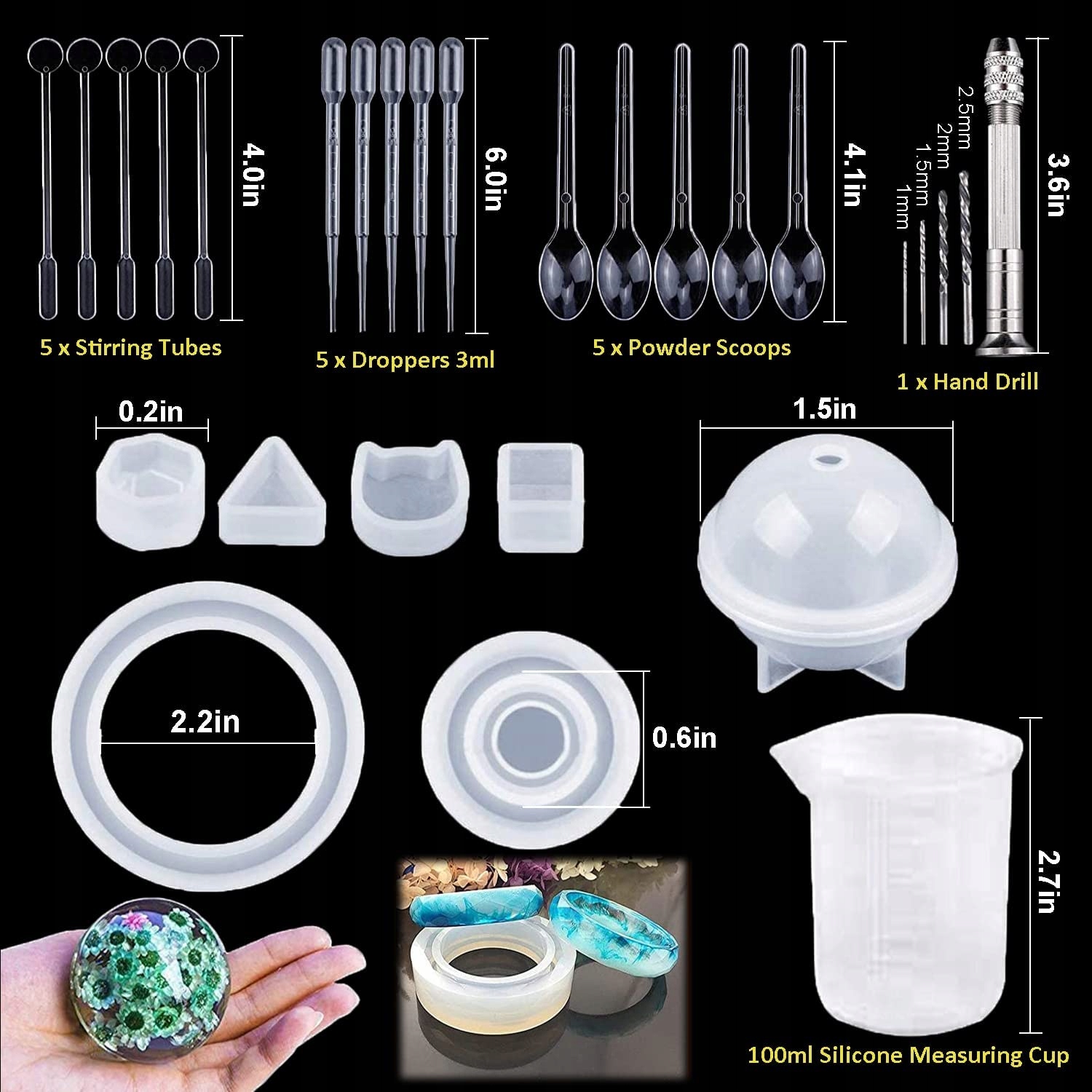 - 【Висока якість】 Форми з епоксидної смоли виготовлені з м’якого силікону, міцні та стійкі до розривів. Легко чиститься та багаторазово використовується. У цей набір також входить ручний дриль із нержавіючої сталі з кількома голками, кілька пластикових мішалок, крапельний наконечник, ложка та шпильки з металевого сплаву, щоб вам було легше працювати зі смолою.