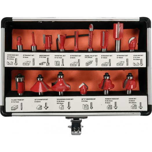 Набір 15 торцевих фрез для обробки дерева. Фрези з хвостовиком 8 мм, ріжучі пластини з карбіду вольфраму з символом YG6X. У комплект входить п'ять фрез з підшипником, що полегшує наведення інструменту. Фрези зі срібним припоєм, допуск розмірів 0,08 мм.