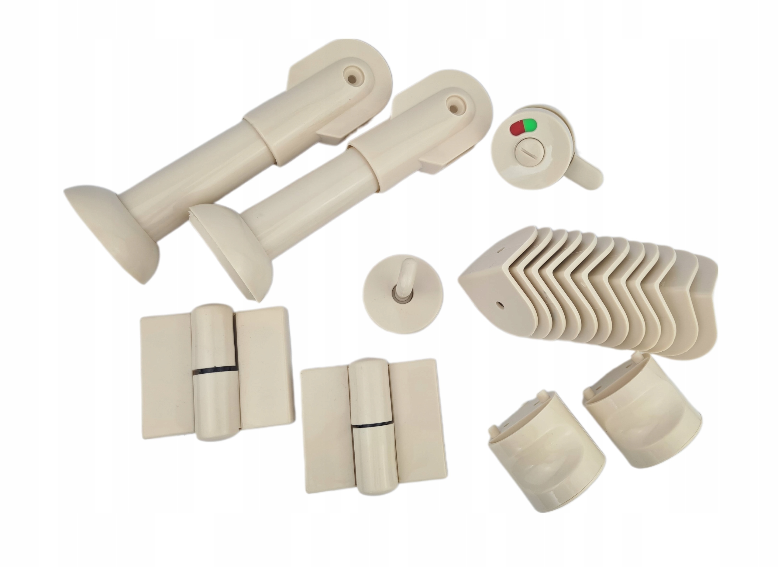 Набір пластикової фурнітури для сантехнічних кабін бежевого кольору.