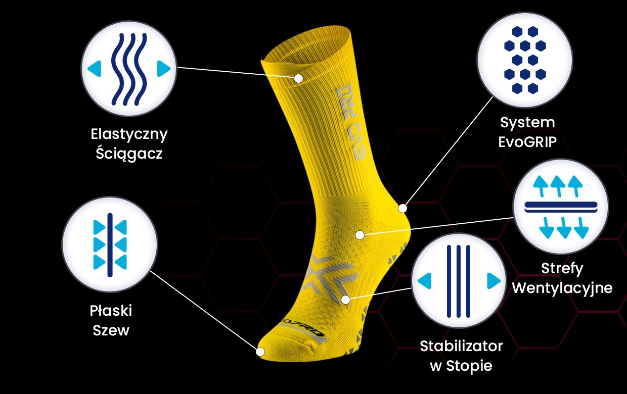 EvoPRO - це одна з кількох колекцій PREMIUM, присвячених конкретним спортивним дисциплінам, які ми створили, щоб ви могли максимально ефективно використовувати свої можливості під час тренування чи матчу. Ми самі чудово знаємо, наскільки важливо, щоб обладнання, яке ми використовуємо під час діяльності, було максимально професійним і якісним, тому ми розробили продукт, який відповідає очікуванням найвибагливіших клієнтів. На нашу думку та думку професійних і аматорських футболістів, EvoPRO є найкращими тренувальними та матчевими шкарпетками на ринку.