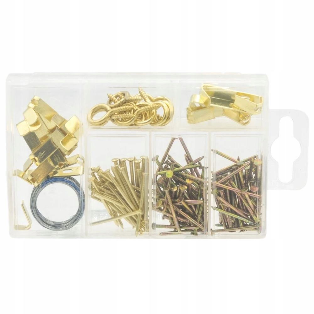 Практичний набір з гачків, цвяхів і шурупів з вушками стане в нагоді в кожному домі. З їх допомогою можна без проблем повісити картини або фото. Весь набір упакований в закриту коробку для зберігання.