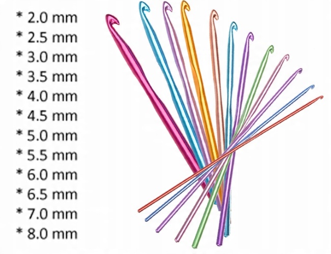 Набір містить 12 різнокольорових гачків різного розміру. 2,0 мм до 8,0 мм. Мають ергономічну форму, плоску вставку та глибокі гачки, завдяки яким пряжа не ковзає, а добре зачіпляється.