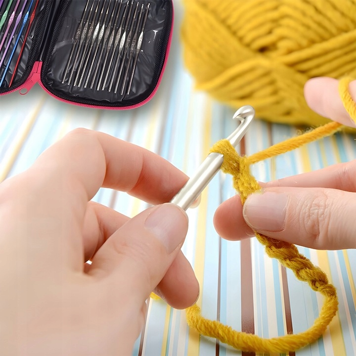Наш набір гачків містить повний набір інструментів, необхідних для початку і розвивайте свою пригоду з в’язанням гачком. Він містить 22 гачки різного розміру (від 0,6 мм до 6,5 мм), що робить його ідеальним як для невеликих, акуратних робіт, так і для великих проектів. Крім того, в набір входить лінійка, лічильники рядків, голки для нитки, шпильки та багато інших корисних аксесуарів.