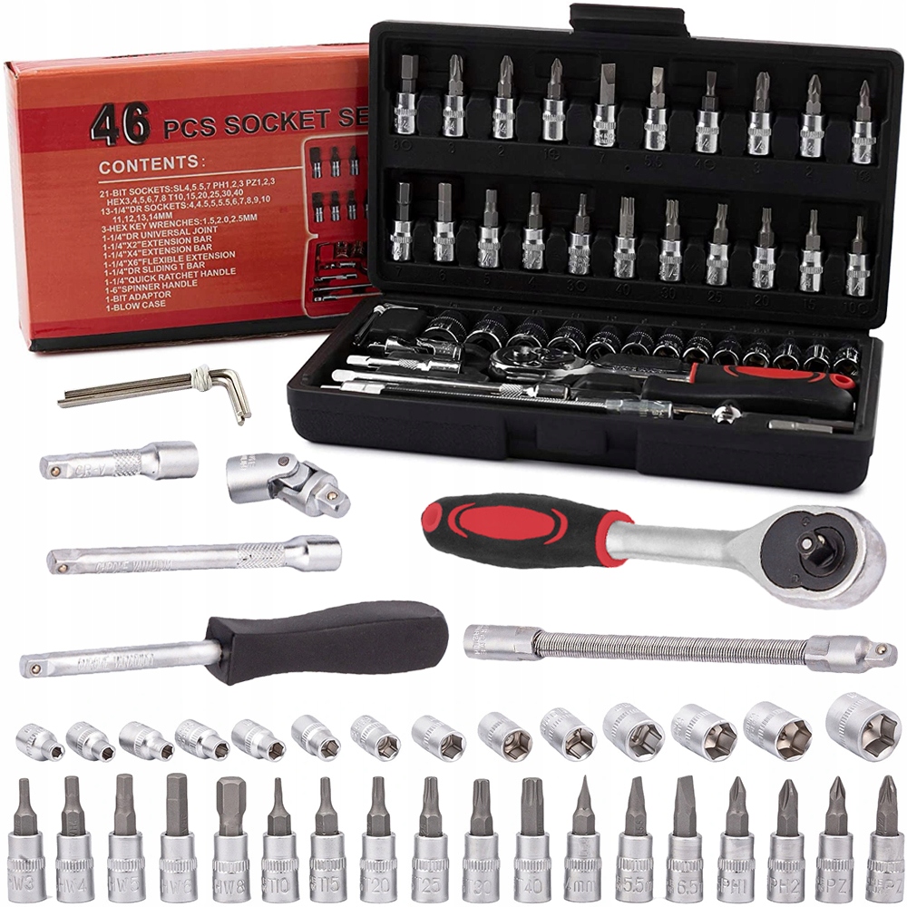 НАБІР ГАЙКОВИХ КЛЮЧІВ, НАКОНЕЧНИКІВ, ХРАПОВИКІВ, ШЕСТИГРАННИХ ПЕРЕХОДНИКІВ TORX, 46 шт.
