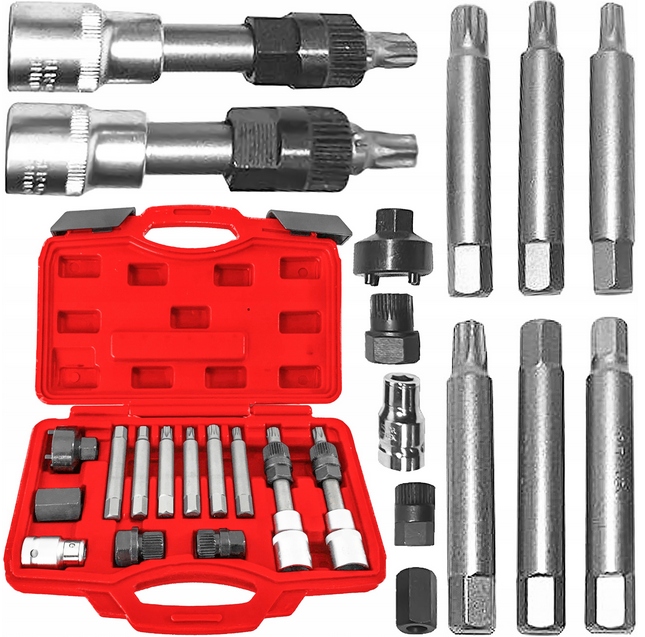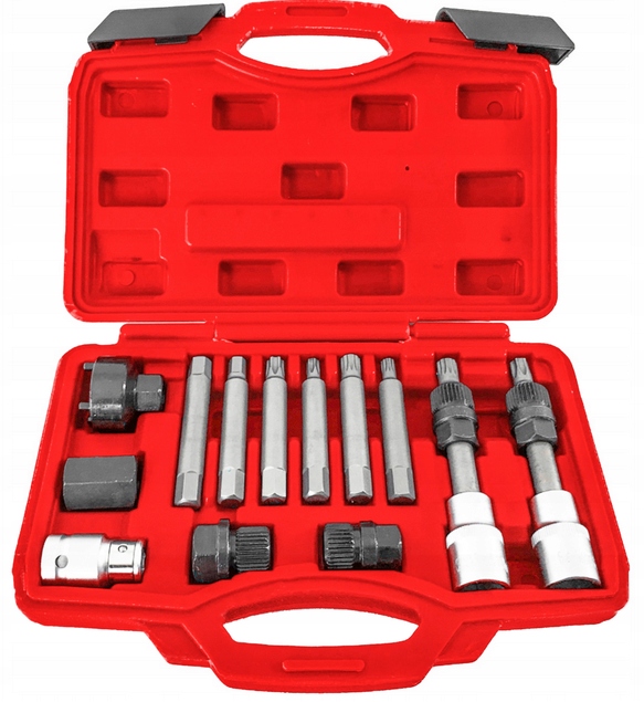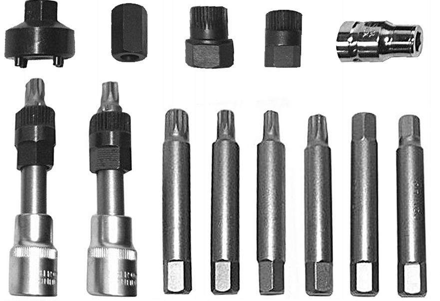 Професійний набір ключів для встановлення та розбирання генераторів Bosch та Magneti Marelli. Адаптовано до автомобілів таких марок: Audi, BMW, Fiat, Ford, Mercedes, Opel, Renault, Peugeot, Seat, Skoda, Volvo, VW та ін. Ключі дозволяють одночасно відкручувати гвинт кріплення шківа (за допомогою відповідної насадки) і утримувати шків з муфтою (за допомогою спеціального гнізда).