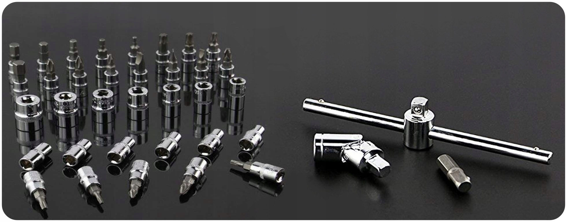 Набір оснащений великою кількістю головок, насадками для викрутки, подовжувачами (включаючи гнучкий), 2 типами ручок - викруткою і поздовжньою, карданним шарніром, адаптером і тріскачкою з перемикачем, що дозволяє швидко і легко змінювати напрямок обертання. Кожен із подовжувачів, ручок, тріскачки та карданного шарніра оснащено кулькою, яка запобігає випаданню прикріпленої розетки - це покращує ефективність роботи та підвищує комфорт і безпеку, жодна розетка не випаде під час роботи.