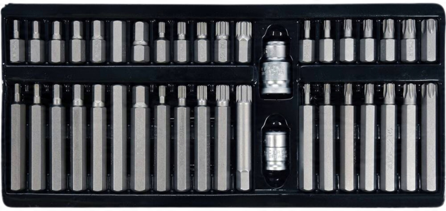 Професійний набір насадок для відгвинчування спеціальних гвинтів, таких як шестигранник, torx, spline. Різноманітність насадок дозволяє виконувати багато робіт в спеціалізованих механічних і автосервісах. Наконечники мають дві довжини: 30 і 75 мм, встановлені в шестигранний тримач 10 мм, адаптований для роботи з тріскачкою 1/2" і 3/8".