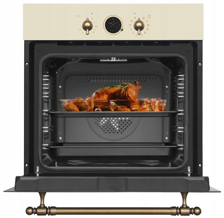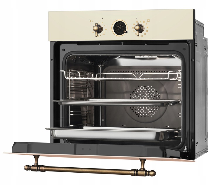 Електрична духовка Amica ED 17319W лінійки RETRO об'ємом 77л, клас енергоспоживання А, ширина 60см. Оснащена таймером з контролем часу випічки. Сталева газова плита шириною 59 см і глибиною 52 см з 4 газовими конфорками кольору слонової кістки.