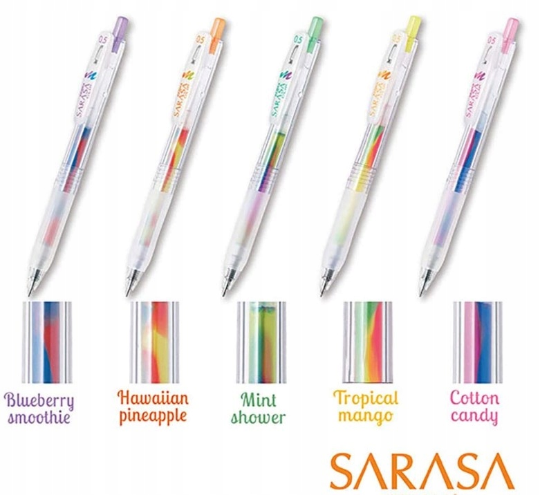 Гелева ручка Zebra Sarasa Clip Marble 0,5 — це унікальна версія, у якій 3 кольори чорнило об'єднані в одній заправці, вони з'являються у випадковій комбінації під час письма. Sarasa Clip Marble — це ручка, розроблена для створення унікального барвистого вигляду ваших нотаток, планувальників або для того, щоб додати трохи сюрпризу вашим листам чи щоденнику. Самі назви кольорів говорять про щось унікальне, наприклад: Чорничний смузі, Цукрова вата, Гавайський ананас, М’ятний душ і Тропічний манго