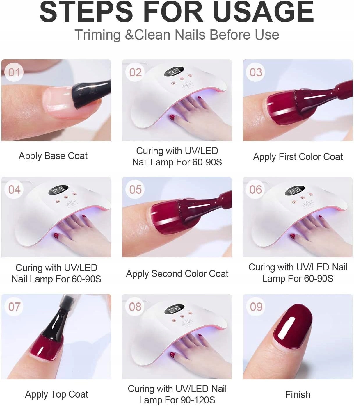 Після нанесення лаку просушіть нігті УФ/LED лампою 60-90 секунд.Якщо гель густий або липкий, помістіть його в гарячу воду на 1-2 хвилини, вийміть з води та добре струсіть.