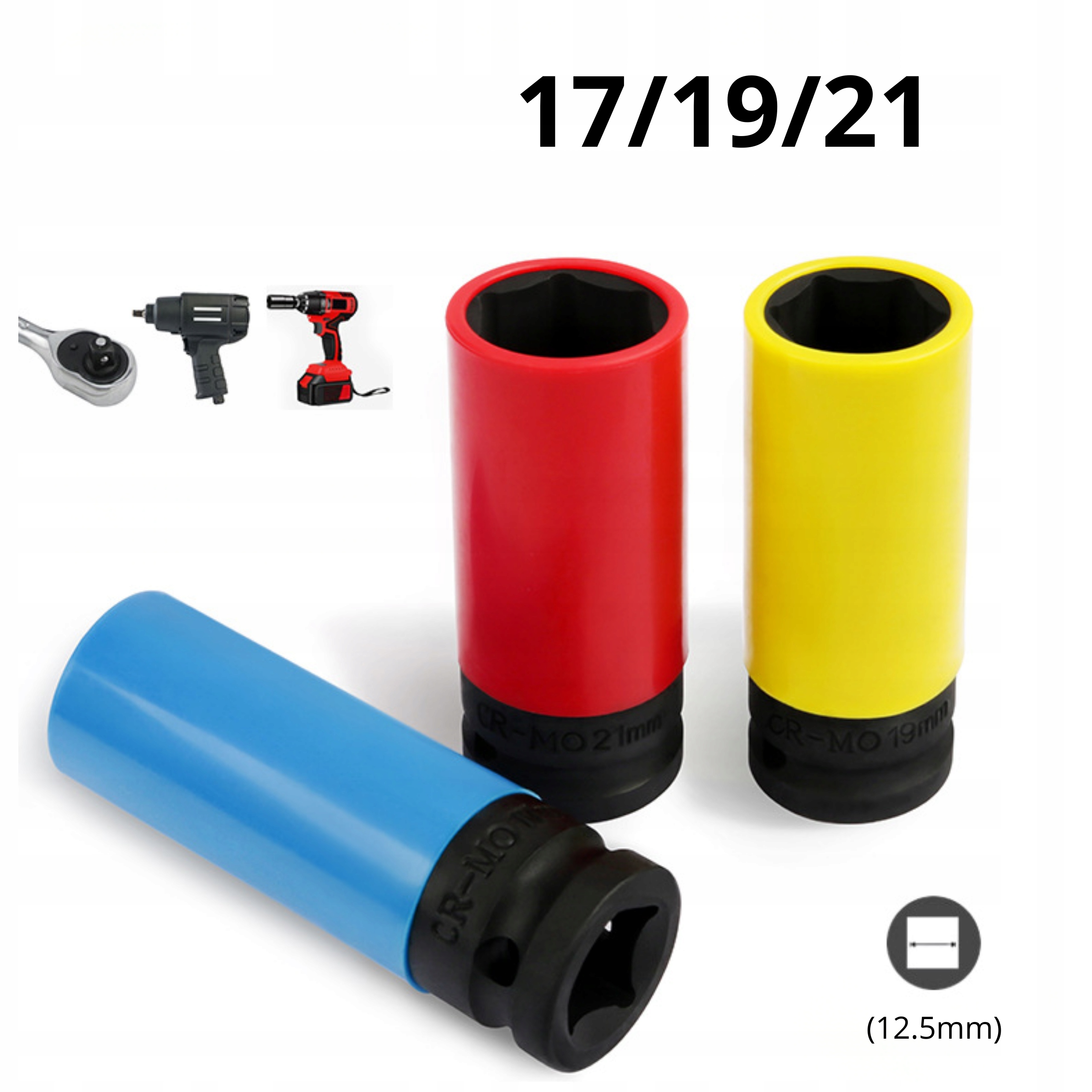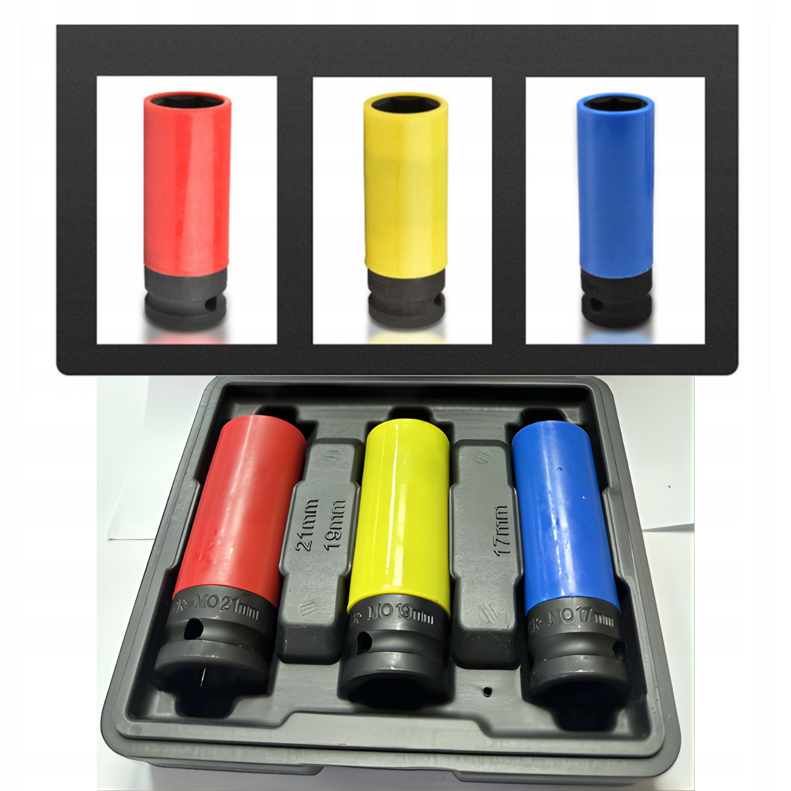 НАБІР УДАРНИХ ГНІЗДІВ 1/2" для алюмінієвих дисків, 3 шт., 17, 19, 21 мм, кольорові