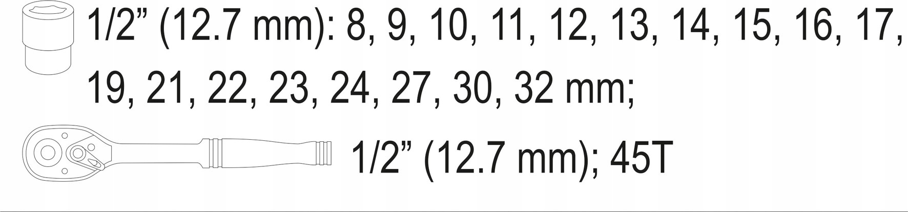 В набір входять такі розміри головок: 8, 9, 10, 11, 12, 13, 14, 15, 16, 17, 19, 21, 22, 23, 24, 27, 30, 32 мм, ручка-тріскачка /тріскачка/ 1/2" 45T.