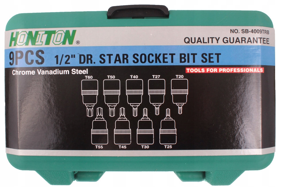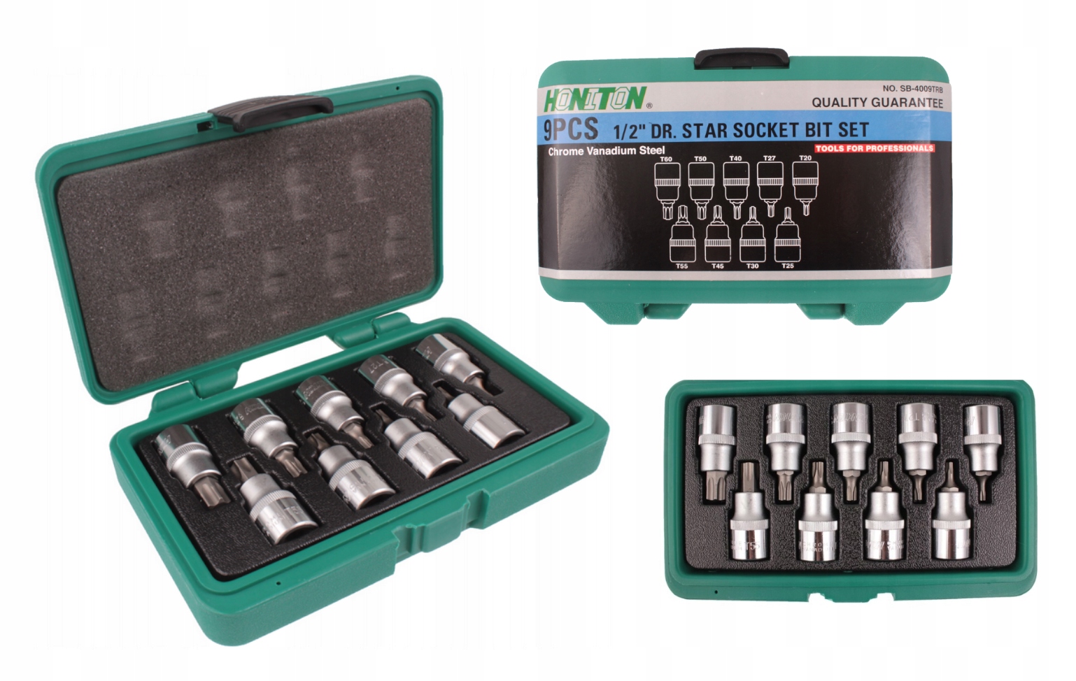 Набір торцевих ключів TORX 1/2" із 9 шт. HONITON. Ключі виготовлені з хромованадієвої сталі, що забезпечує високу міцність торцевих торців. Поставляється в зеленій валізі.