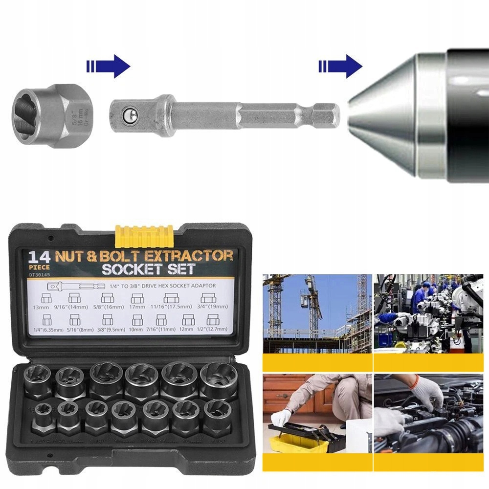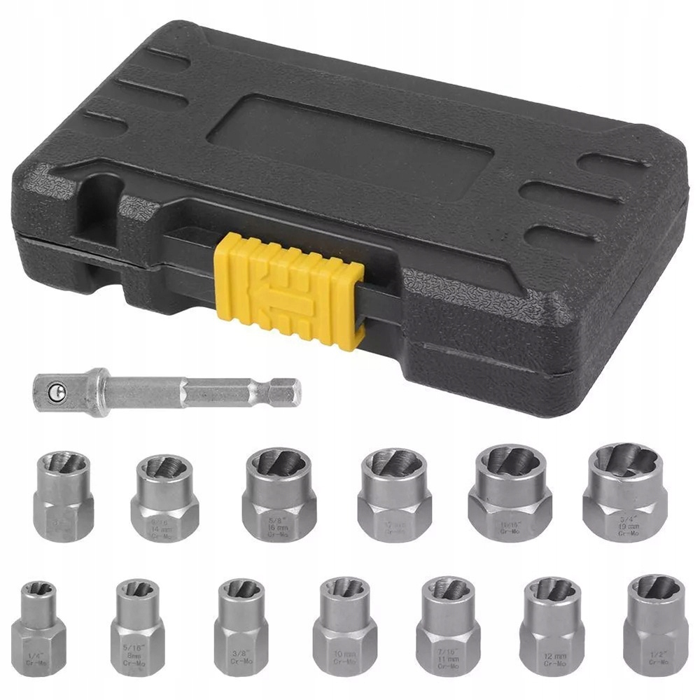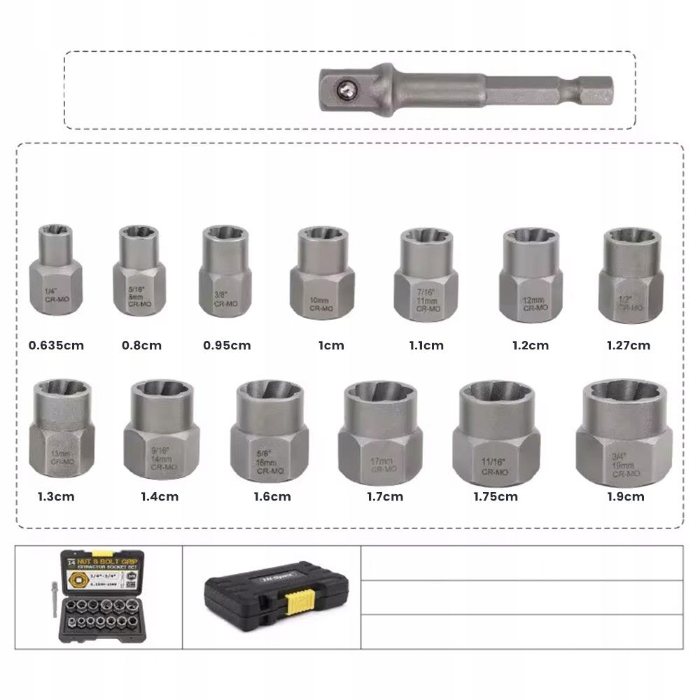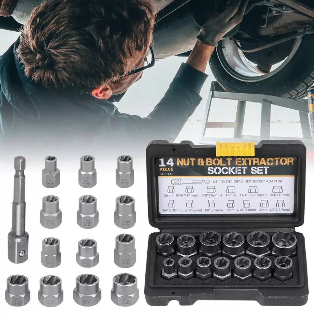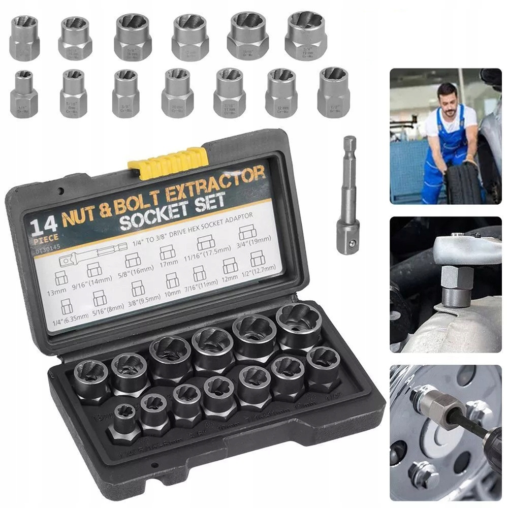 Набір для виймання болтів із 14 частин, сумісний із храповиками з квадратним приводом 3/8" або ламелями, призначений для видалення пошкоджених, замерзлих, іржавих або закруглених болтів, гайок і болтів.