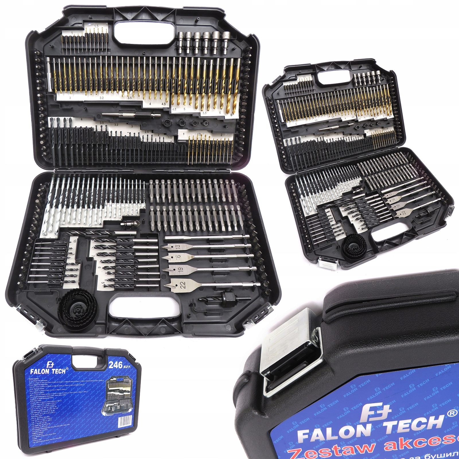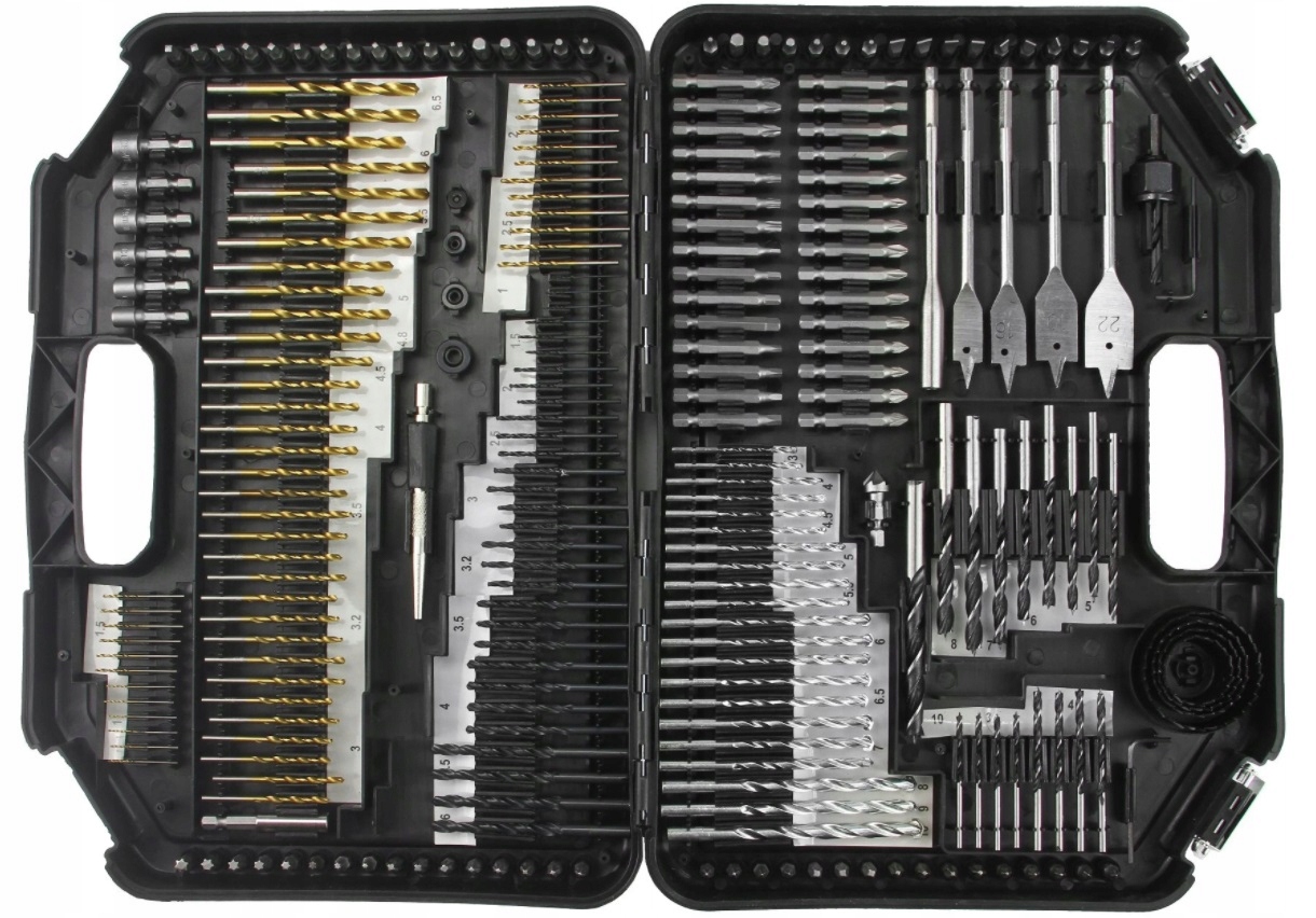 Набір аксесуарів, що складається з усіх 246 підручних елементів, дозволить виконувати різноманітні роботи. У набір входять свердла по дереву, свердла по металу, свердла по бетону, наконечники, свердла перо, діркові пилки, насадки, головки під шестигранник, зенкер, шестигранний ключ, адаптери. Все помістили в міцну валізу, завдяки чому зберігання і транспортування такого великого набору не викличе жодних проблем. Кожному аксесуару відведено певне місце у валізі, що дозволяє легко підтримувати його в порядку. Виготовлений зі швидкорізальної сталі HSS.
