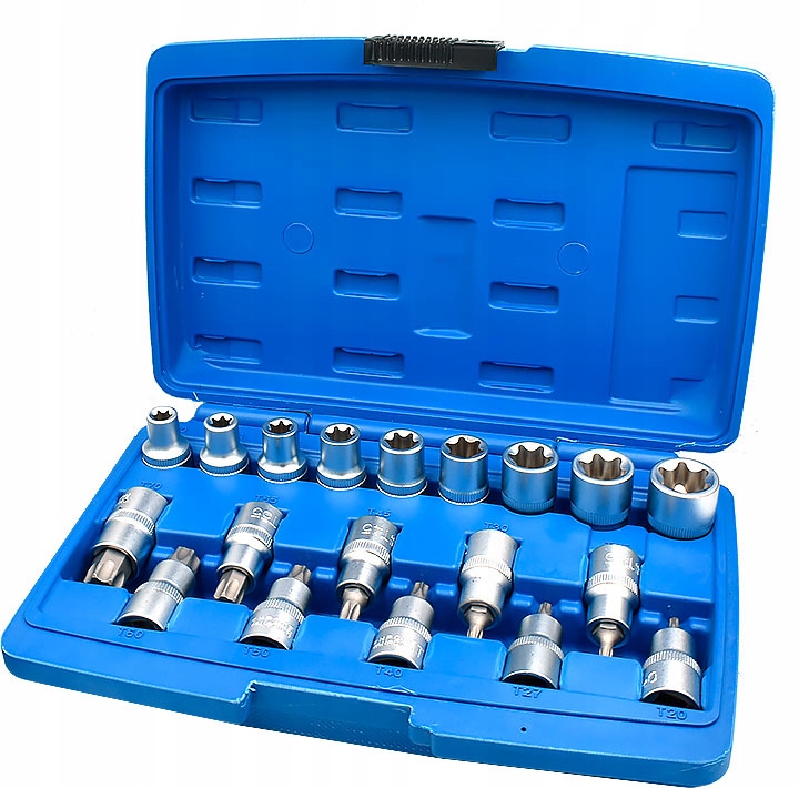 - Набір складається з 19 головок і насадок Torx, які використовуються, зокрема, в обслуговуванні популярних марок автомобілів.