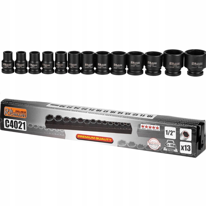 - Набір із 13 шт. ½” шестигранних розеток розміром 10–24 мм у металевій упаковці.