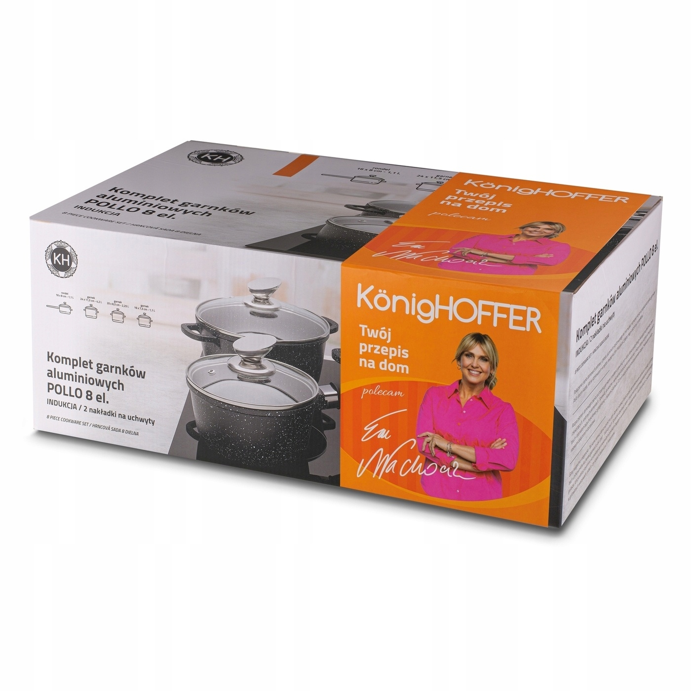Набір мармурових каструль Konighoffer Pollo із 8 предметів має 2 силіконові кришки на ручках. Набір дозволяє безпечно готувати і смажити, знижуючи ризик обпалити руки. У набір входять посудини об'ємом від 1,2 до 4,5 л. Каструлі та каструлі оснащені скляними кришками зі сталевим бортиком для захисту від сколів. Вони також мають стильні ручки з нержавіючої сталі. З набором кам'яних каструль Pollo ви можете готувати на будь-якій плиті. Гранітне антипригарне покриття та мармурове оздоблення алюмінієвих корпусів додають йому елегантності. Вони швидко нагріваються, тому ви заощадите час і енергію. Вони ідеально підійдуть для сімейної кухні або на подарунок. Вони також добре захищені від високих температур і рівномірно проводять тепло. У вас також є можливість використовувати каструлі (не каструлю!) в духовці при температурі не більше 220 градусів Цельсія. Їх безпечне використання та нетоксичний дизайн для навколишнього середовища підтверджено маркуванням без PFOA. Щоб не пошкодити стіл або кухонну стільницю, просто використовуйте 2 підкладки для гарячого посуду, що входять в комплект. Ручка каструлі оброблена м'яким на дотик матеріалом. Завдяки цьому він не ковзає в руці і не нагрівається, а також приємний на дотик. Продукт рекомендований Ewa Wachowicz. Як амбасадор бренду Konighoffer, вона тепло та з усмішкою рекомендує його для домашнього використання. Разом з ним ви отримаєте свій рецепт для дому. Це один із найкращих варіантів у цій категорії!