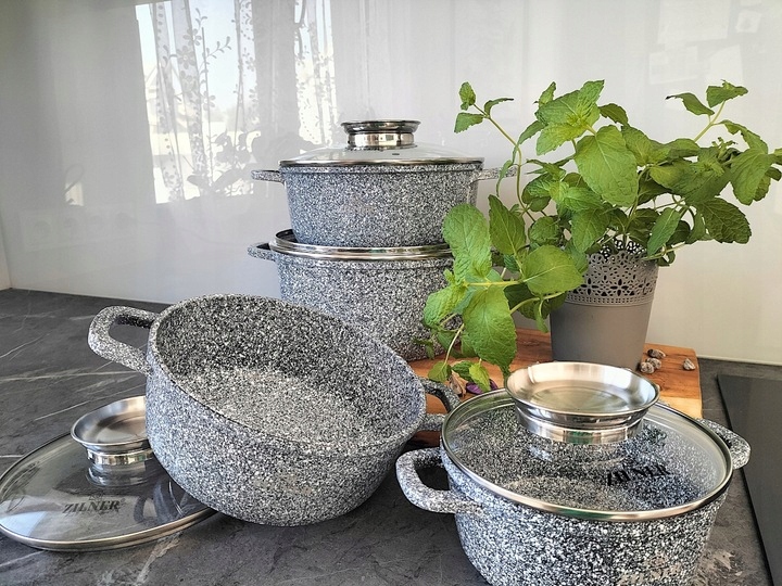 ➖Унікальний набір із 4 мармурових каструль Zilner 8532 з кришками, які мають дозатори для рідкі спеції та дві насадки для перенесення ❤️