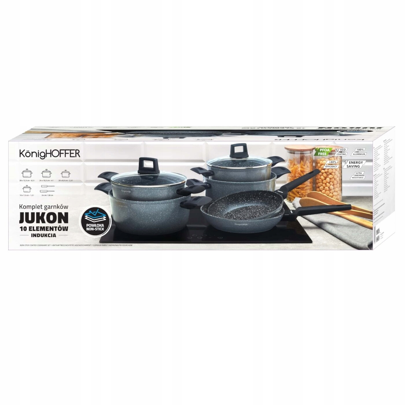 Набір каструль Konighoffer Jukon із 10 предметів має антипригарне покриття для легкого догляду (не можна мити в посудомийній машині, лише вручну). Набір міцний і дозволяє безпечно готувати і смажити, знижуючи ризик обпекти руки. У набір входять посудини об'ємом від 1,2 до 6,5 л. Каструлі оснащені скляними кришками зі сталевим бортиком для захисту від сколів. Також вони мають стильні м'які ручки, які не нагріваються та не ковзають у руці. З набором каструль і 2 сковорідок Jukon ви можете готувати на будь-якій плиті. Його елегантність підсилюється мармуровим антипригарним покриттям, яке витримує багато циклів стирання (5000!), і обробкою алюмінієвих корпусів, викованих при високій температурі. Вони швидко нагріваються, тому ви заощадите час і енергію. Ідеально підійдуть для сімейної кухні або на подарунок. Вони також добре захищені від високих температур і рівномірно проводять тепло. Вони забезпечують міцне зчеплення при носінні. Їхнє безпечне використання та нетоксичний для навколишнього середовища дизайн позначені знаком «Без PFOA».
