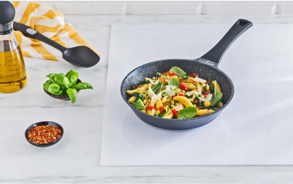 - Глибока сковорода Die Cast , тобто з литого алюмінію, який є найбільш міцним матеріалом, стійким до деформації, змінами температури, а також довгим рівнем використання. Внутрішня частина сучасного, тришарового, нештрихового гранітного покриття Greblon®. 4 Завдяки інноваційній технології, яка дозволяє зменшити кількість покриттів до трьох шарів, продукти чорного каменю ідеально проводять та накопичують тепло . Їх можна використовувати на всіх типах плит, а повний індукційний диск, що становить дно, збільшує енергоефективність приблизно на 40 %.
