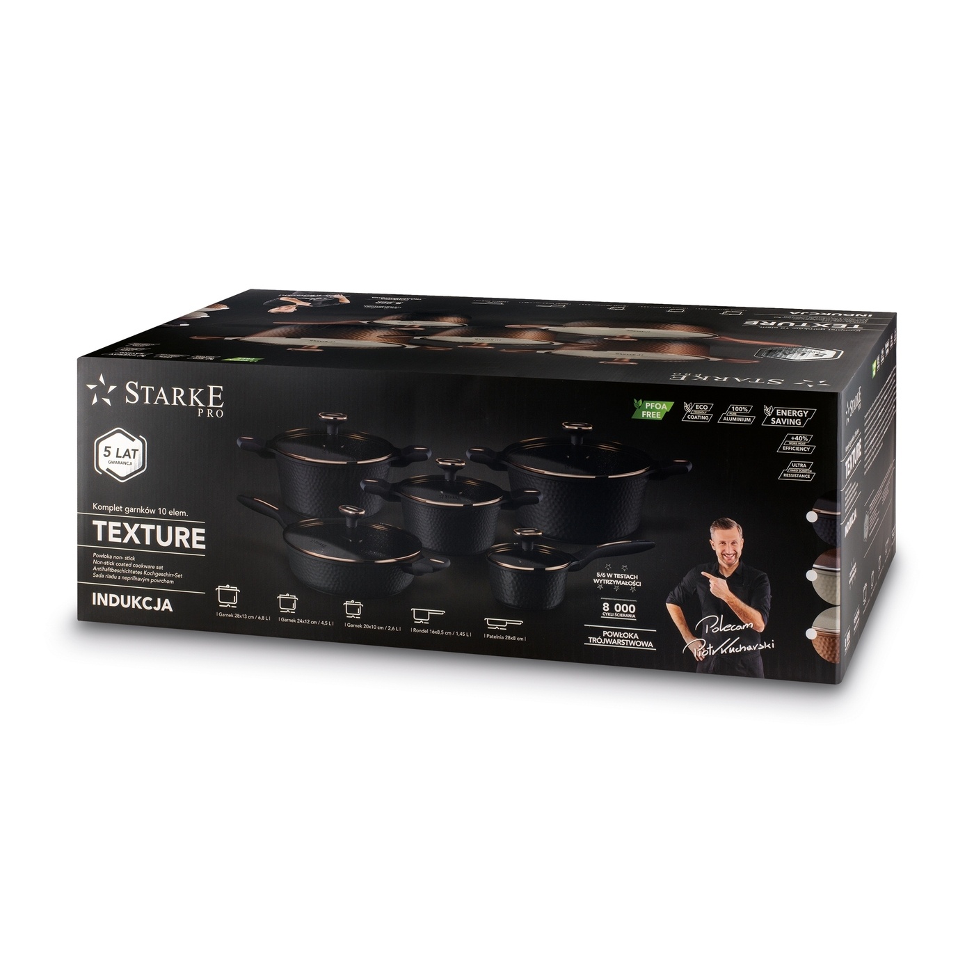 Starke Pro Texture Grey 10 елементів використовує антипригарне покриття, яке полегшує турботу (не посудомийна машина, а ручне миття). Набір є твердим і дозволяє забезпечити безпечне приготування їжі та смаження, зменшуючи ризик спалювання рук. У наборі ви знайдете посуд з потужністю від 1,45 до 6,8 літрів. Скляні кришки зі сталевим краєм прикріплювались до горщиків, каструлі та сковороди, захищаючи від чіпінг. У них також є стильні м'які дотик, які не нагріваються і не ковзають в руках. Ви можете готувати з набором горщиків, каструлі та каструлі з текстурою на будь -якому дотику. Мармурове ніздекське покриття додає елегантності, яка витримає багато циклів стирання (8000!) Та завершення алюмінієвого лиття та дуже добре врівноваженого. Вони швидко нагріваються, тож ви заощадите час та енергію. Вони чудові на сімейній кухні або в подарунок. Вони також добре захищені від високої температури і рівномірно проводять тепло. Вони забезпечують певний зчеплення при перенесенні. Без PFOA -це позначення їх безпеки та нетоксичної структури навколишнього середовища. Посол бренду та професійний шеф -кухар, Піор Кучарський, рекомендує вибрати цей набір. На його думку, що підтримується особистими тестами, він заслуговує на найвищу оцінку якості та функціональності. Набір текстури Starke Pro покривається гарантією надійності!