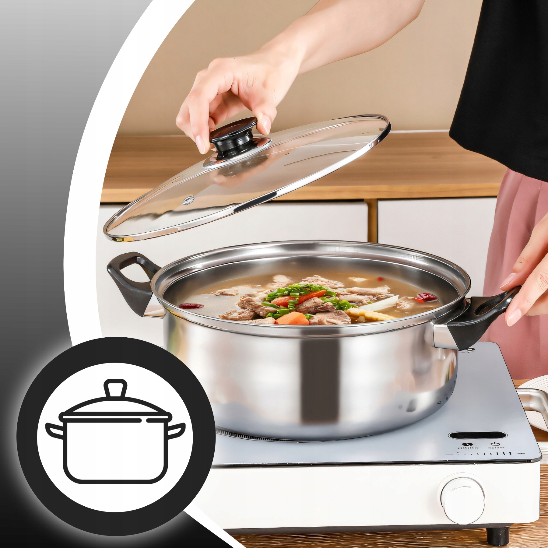 містить всі необхідні аксесуари , які дозволяють готувати на газовій та індукційній плиті , добре перевіряючи як у повсякденній кулінарії, так і під час приготування більшої їжі.