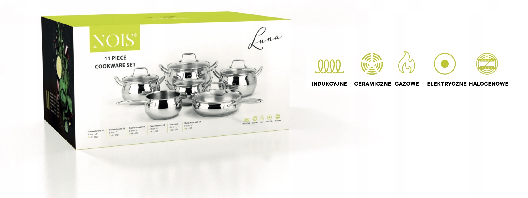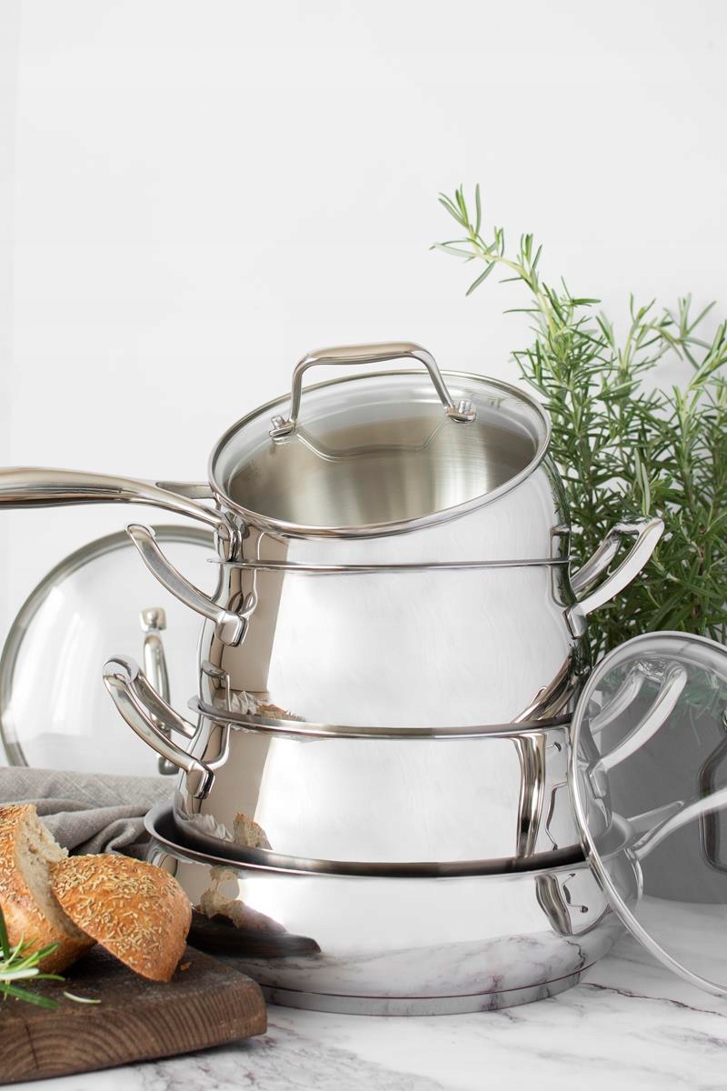 Посуд Luna від торгової марки «NOIS» дуже функціональний і привабливо виглядає на будь-якій кухні. Каструлі виготовлені з хромонікелевої нержавіючої сталі (18-20% хрому і 8-10,5% нікелю) 18/10 (марка AISI 304) з товщиною стінки 0,8 мм b>, яка є одним з найбільш екологічних сплавів. Це міцний і майже вічний матеріал. Найціннішою його властивістю є стійкість до корозії. Другим важливим фактором, що визначає високі властивості, є відсутність пор і мінімальна шорсткість поверхні. Ретельно відшліфована поверхня легко чиститься і красива. Унікальні властивості сталі роблять нашу продукцію ідеальною для приготування здорової їжі.
