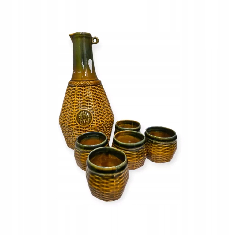 Оригінальний керамічний набір в коричнево-зеленій глазурі, прикрашений візерунком, що імітує косу. Складається з глечика та 5 чашок. Прикрашений у вінтажній/ретро атмосфері, чудово підходить для подачі напоїв або як прикраса інтер’єру.