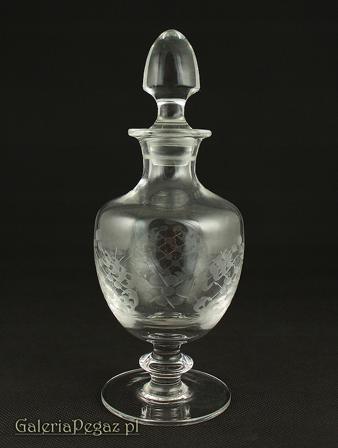 Черевце графина та келихів має виріз ручної роботи з мотивом, що нагадує звивисту лозу та листя.