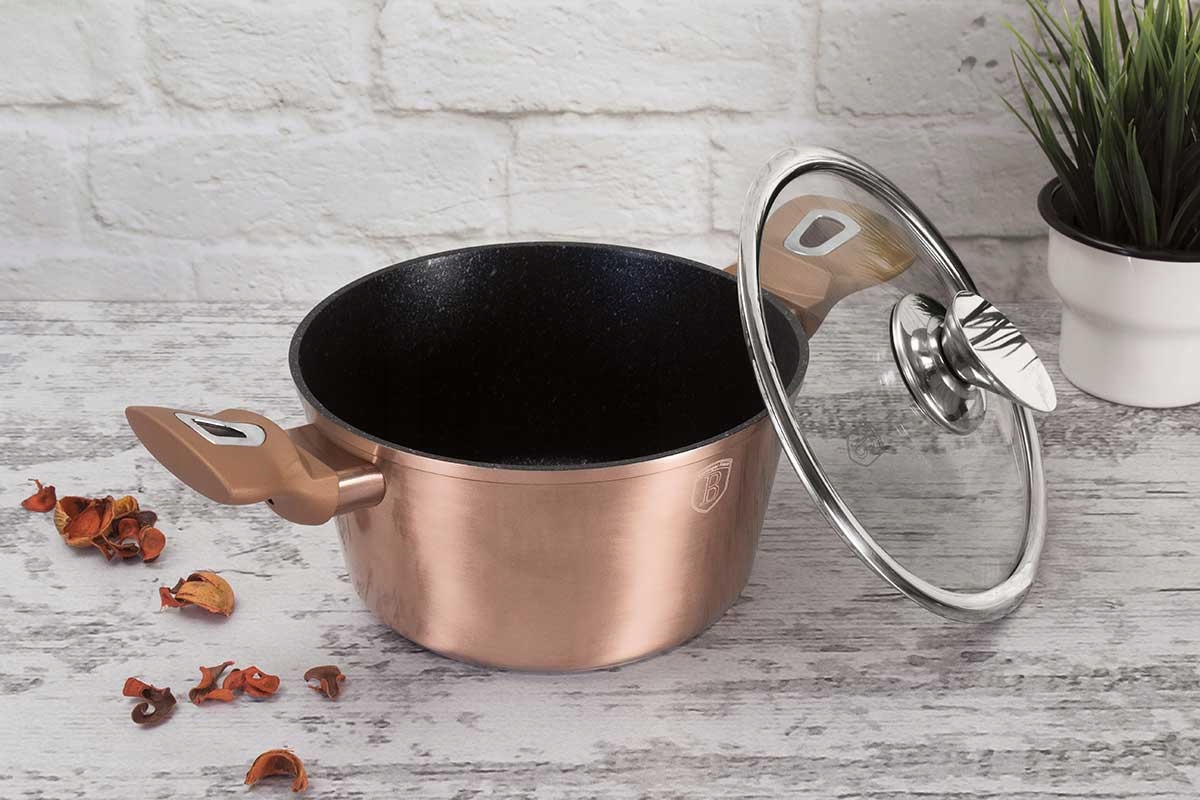 Ексклюзивний дизайн, сучасні технології та найвища якість виконання. Набір посуду серії BERLINGER HAUS METALLIC - ідеальне рішення для людей, які очікують довговічності, комфорту та елегантного зовнішнього вигляду на кухні. Виготовлений із високоякісного кованого алюмінію та покритий потрійним гранітним покриттям (мармур), він забезпечує чудові результати приготування з мінімальним енергоспоживанням.