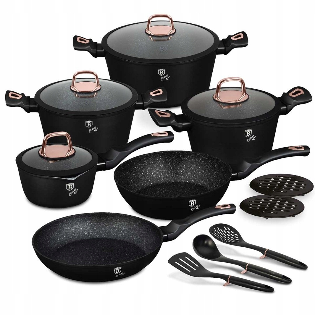 15-елементна набори Berlinger Haus з чорних рожевих серій Berlinger Haus виготовлений з вищого класу алюмінію, покритого потрійним покриттям граніту (мармуровим) з дуже високим коефіцієнтом високої твердості. Ці привабливі та модні страви оснащені як стандартні з м'яким дотиком (силіконова ручка). Пристосований до всіх видів плит: газ, електричний, керамічний, галоген, індукція. Система турбо -індукції (вони нагріваються дуже швидко) економить до 35% енергії.