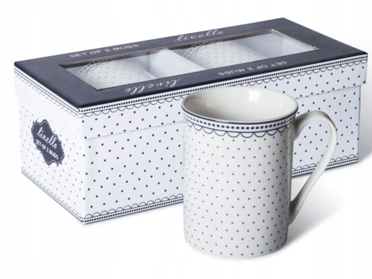 Набір з двох кухлів колекції Livello - порцеляна теплого білого відтінку. По всій поверхні порцелянові кухлі прикрашені чарівними темно-синіми копійками. Така ж прикраса була повторена на елегантній коробці.