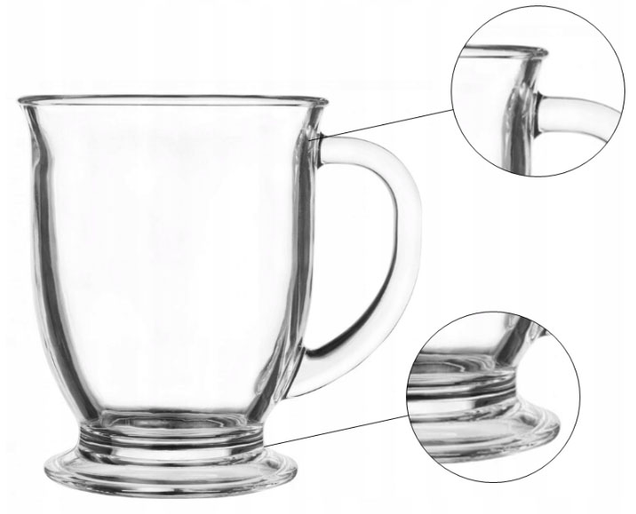 Зручна ручка, форма і розмір склянки роблять виріб естетичним і функціональним, дозволяючи приготувати подвійну порцію улюбленого напою. У набір входить 6 глянцевих і прозорих скляних кухлів класичної форми, які ідеально підійдуть до будь-якого стилю інтер'єру.