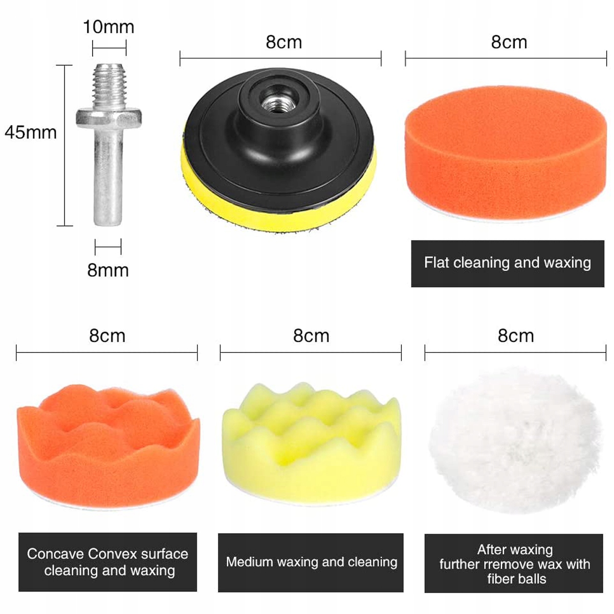 - Набір для полірування автомобіля з 22 частин: містить губки для полірування автомобіля з 16 частин 5 різних кольорів і жорсткості, вовняну полірувальну подушечку з 2 частин, адаптери для свердла з 2 частин і 2 часткові M10 з'єднувальні гвинти. Виготовлений із високоякісного губчастого матеріалу, міцного та зносостійкого, без подряпин та гнучкості, сильно вбирає воду та практичний.