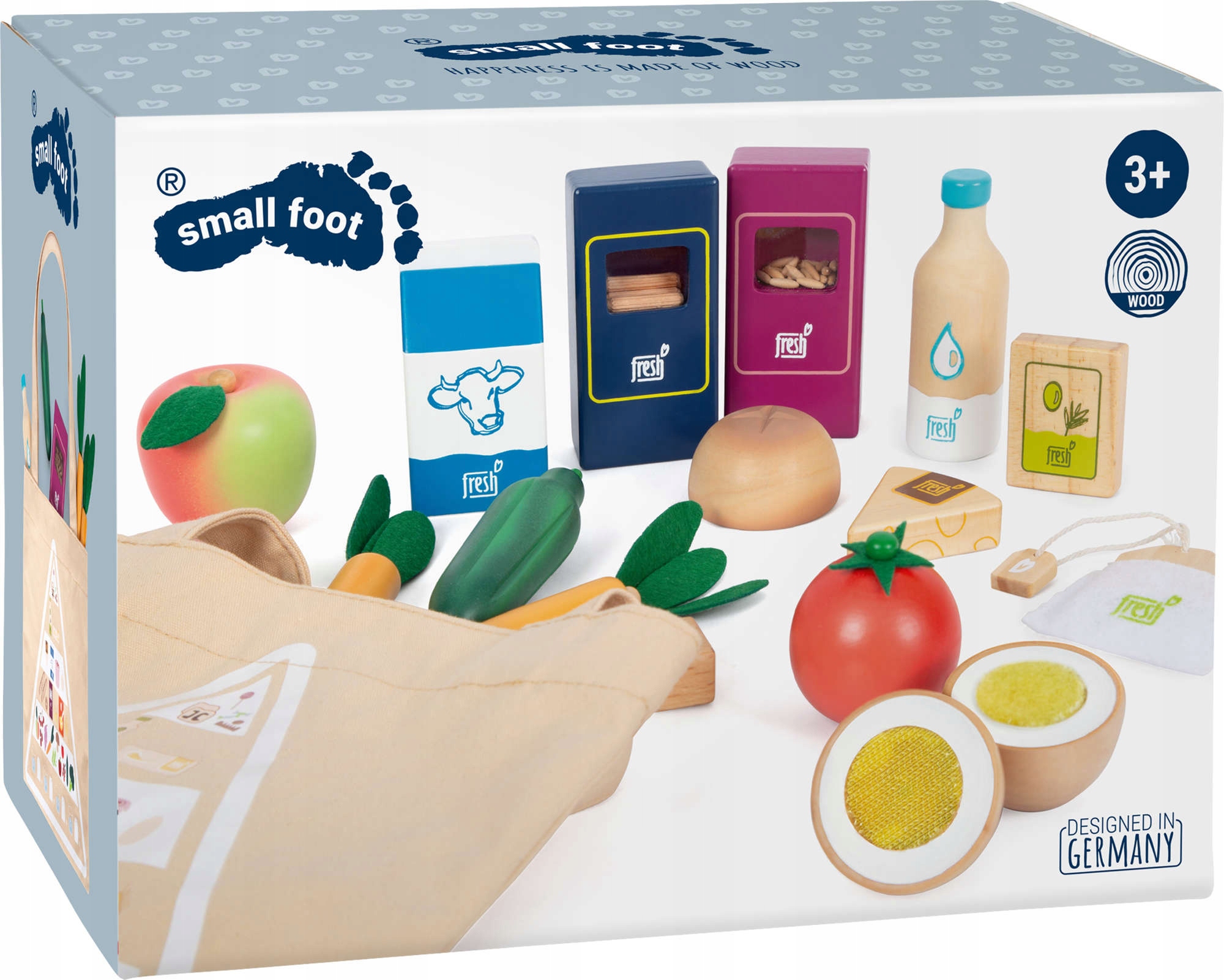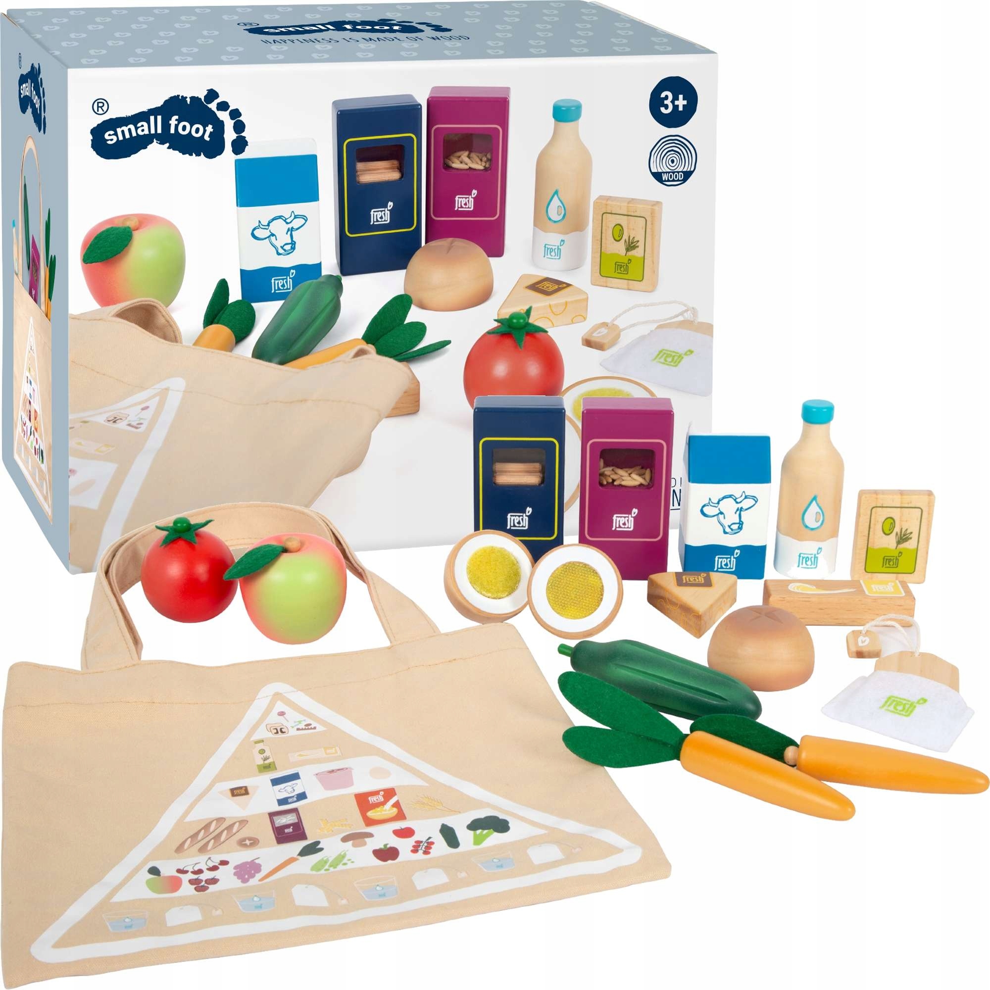 У набір входить бавовняна сумка для покупок із надрукованою на ній харчовою пірамідкою - так діти можуть навчитися про правильне харчування.