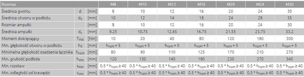 - Продукт схвалено для використання з різьбовими стрижнями в бетоні без тріщин (ETAG 001 варіант 7).