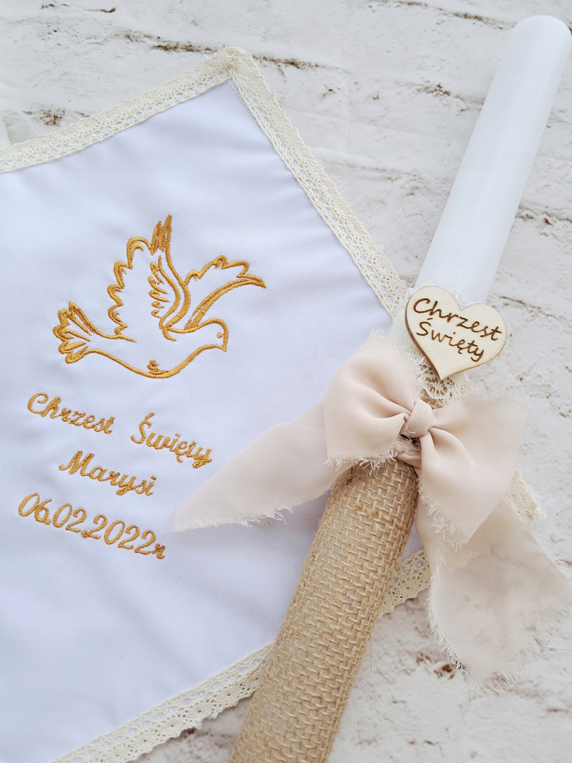 The candle is wrapped in juice finished with lace, chiffon bow and also a heart with engraving