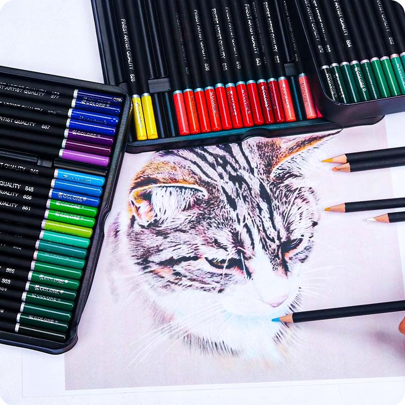 Все упаковано в зручний металевий футляр з відділеннями, завдяки яким можна швидко знайти потрібний колір. Високоякісні олівці з високим вмістом пігменту дозволяють створювати чудові композиції.