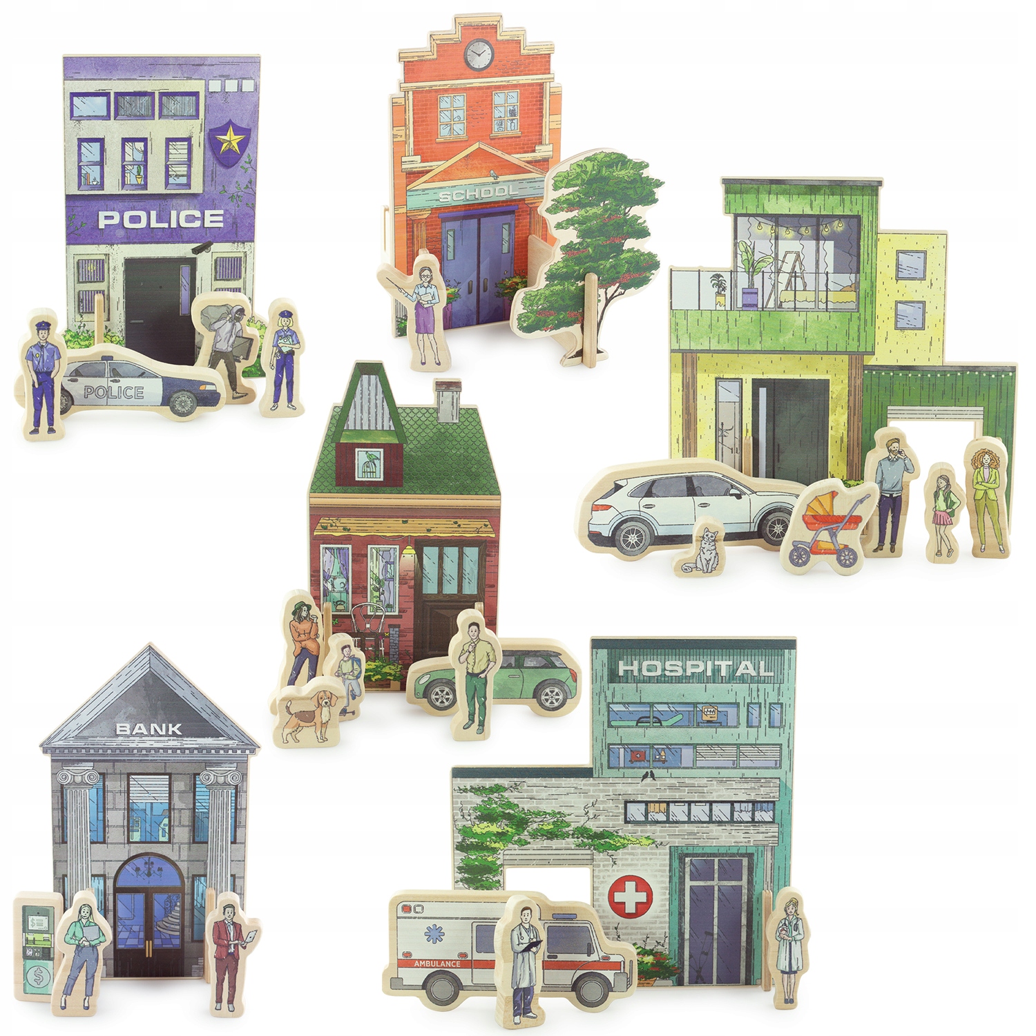 Набір включає: 6 будівель (банк, лікарня, школа, відділення поліції, 2 будинки); 12 будівельних стендів; Подвійні статуетки людей 15 шт.; 2 фігури об'єктів та 1 фігурка дерева (подвійний -розділений), 2 статуетки тварин (подвійний -ділянок); 4 статуетки транспортного засобу (подвійний); Дерев’яний лоток.